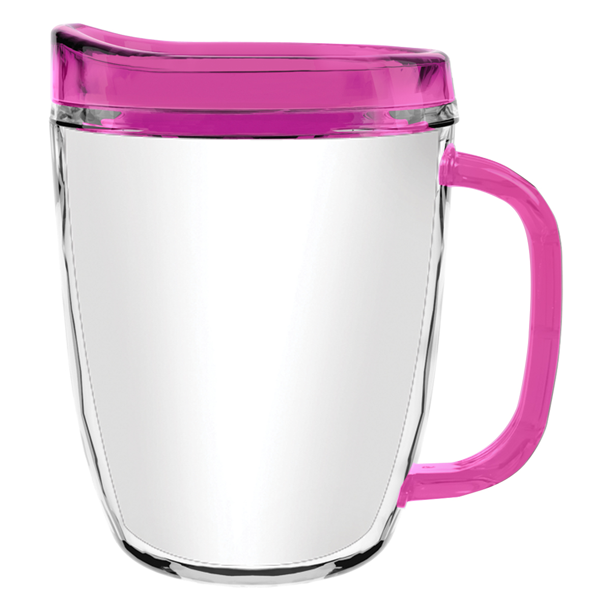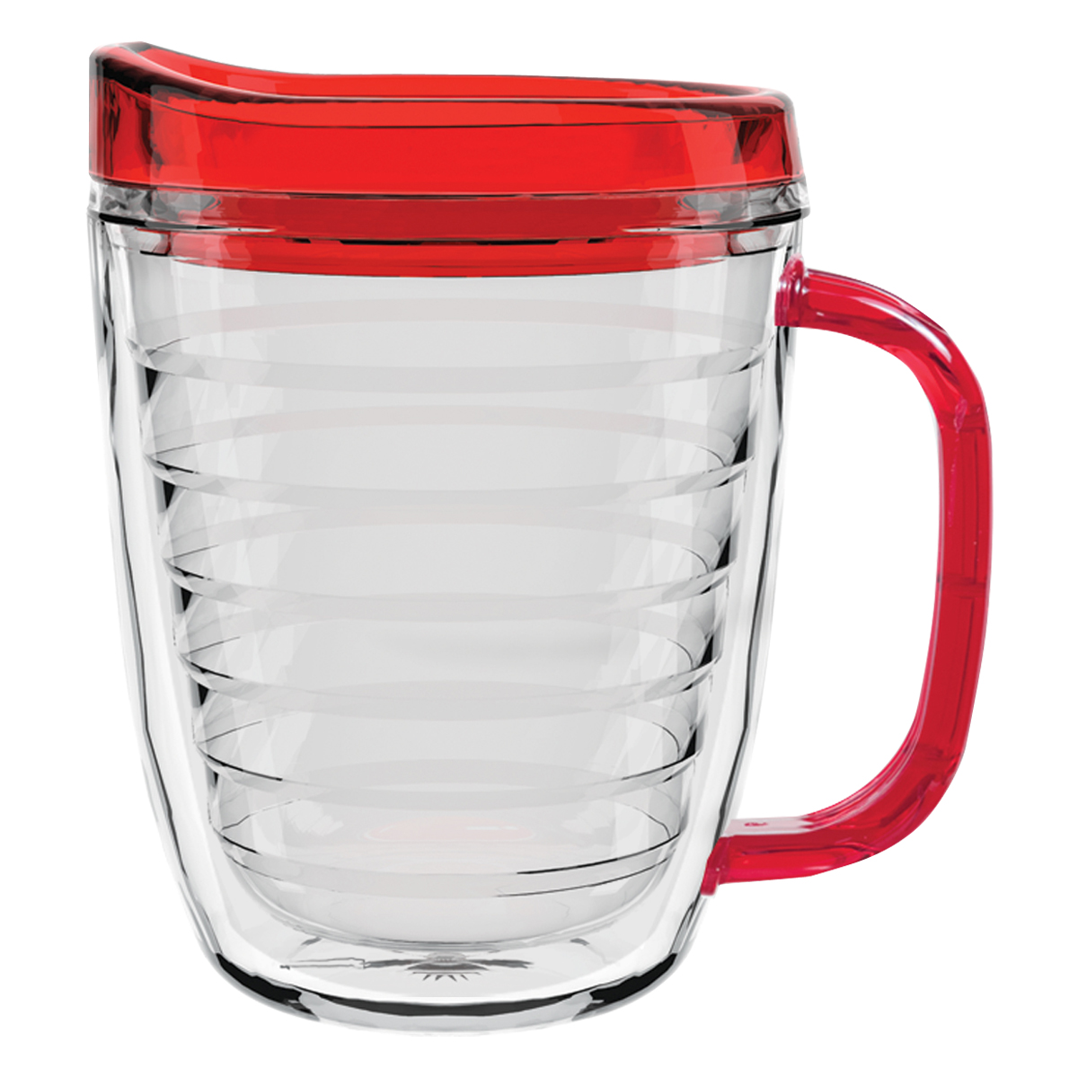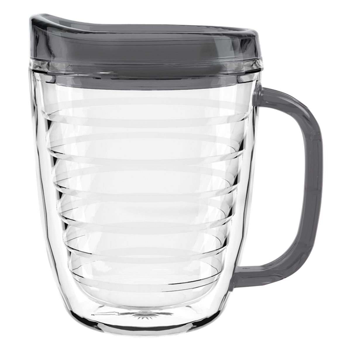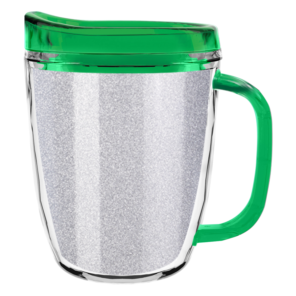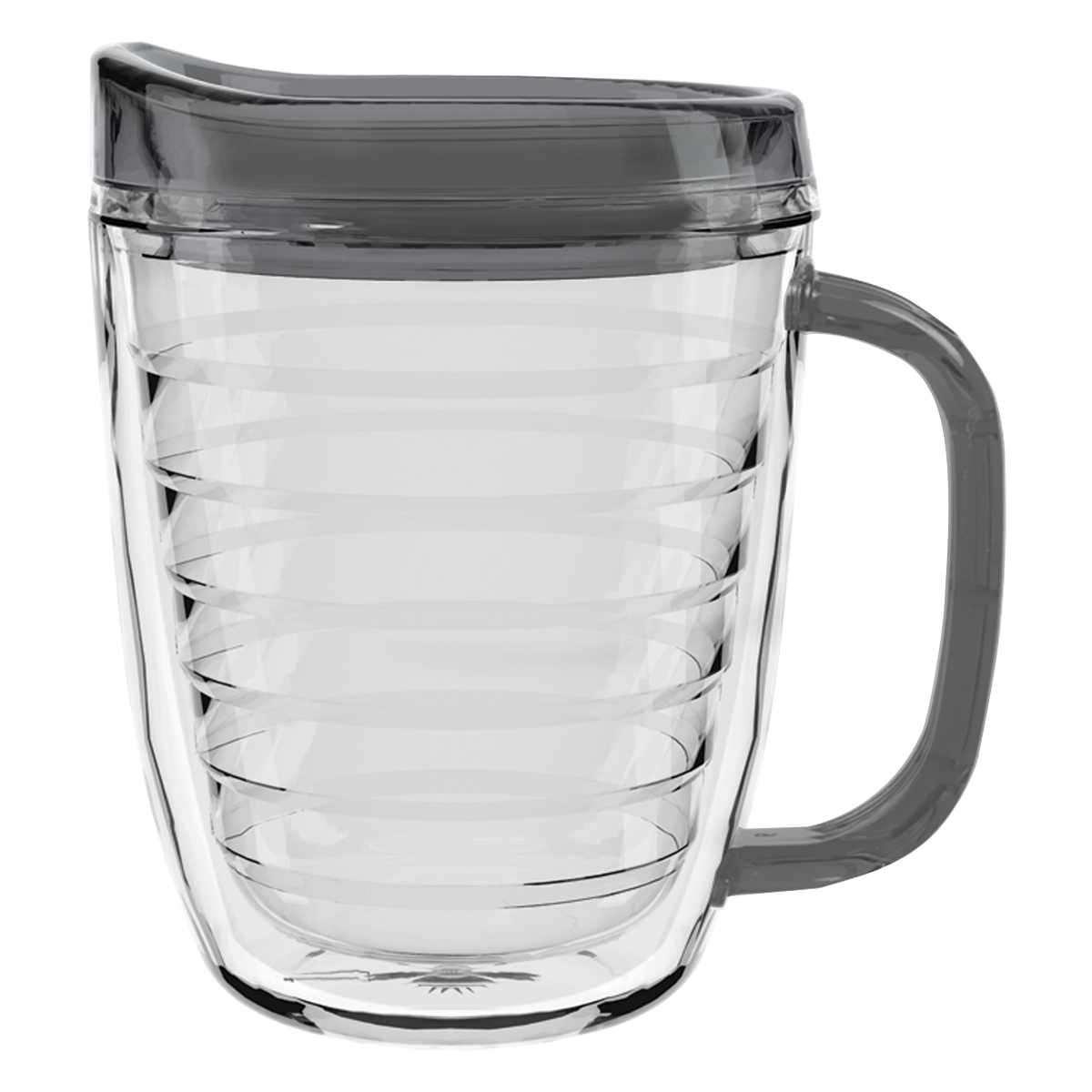 Clear Mug with Translucent: Clear, Charcoal, Orange, Purple, Blue, Green, Red, Lime Green, Yellow, Navy, Fuchsia, Mocha or Dark Green Lid and Handles.
