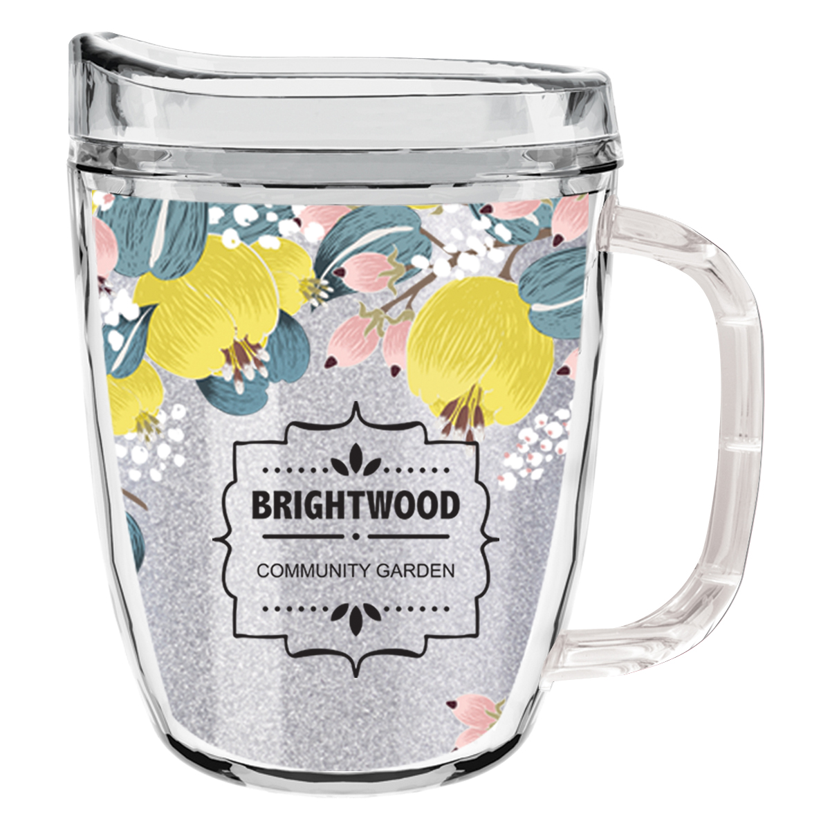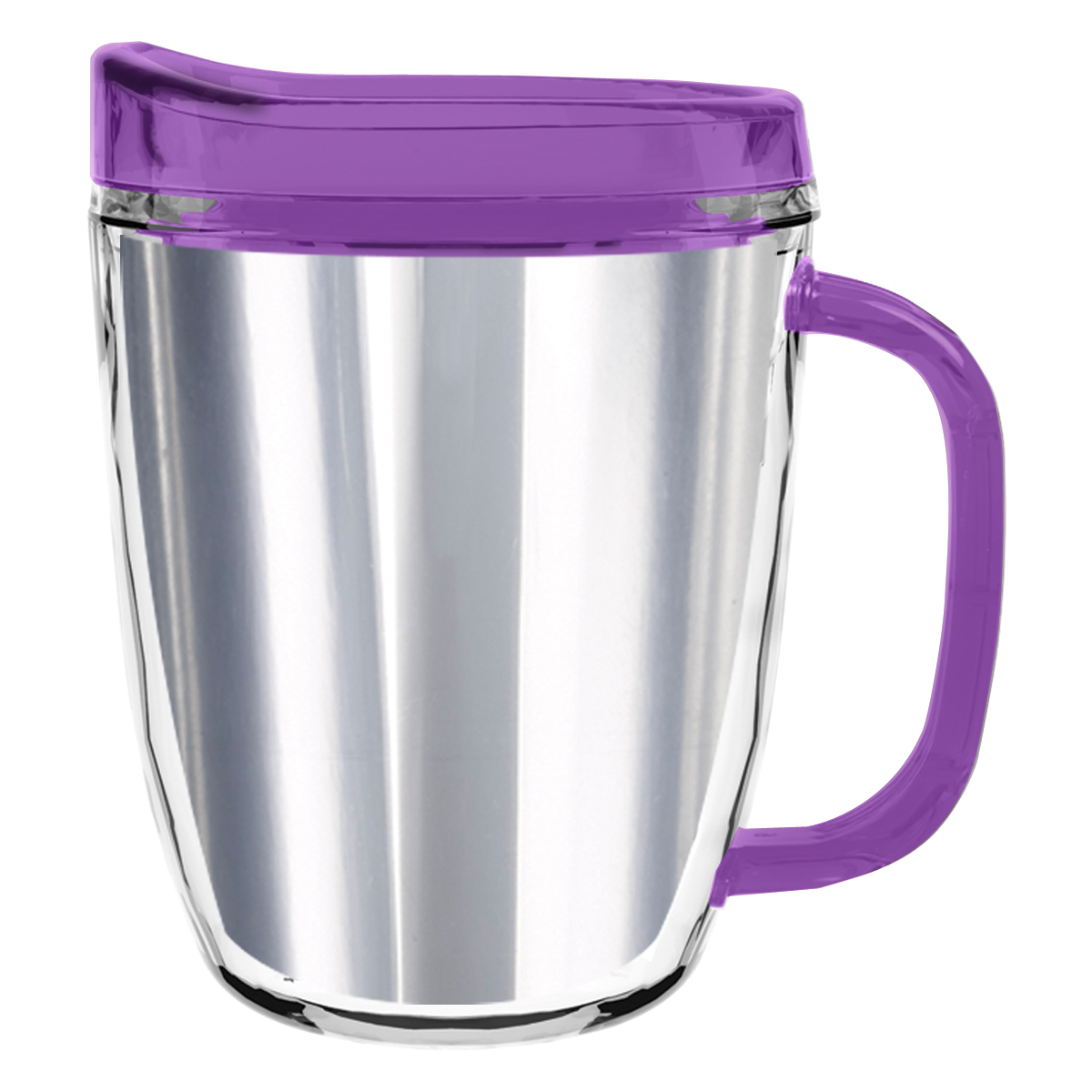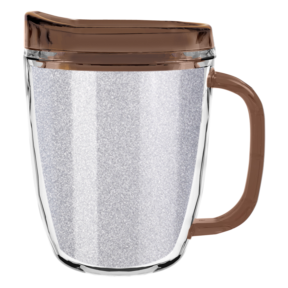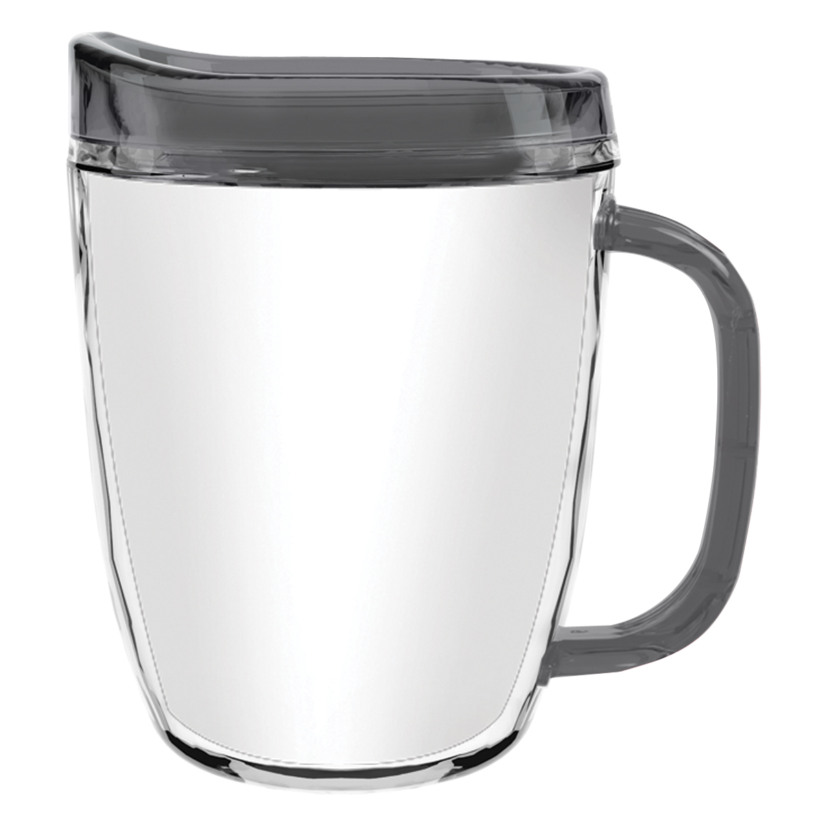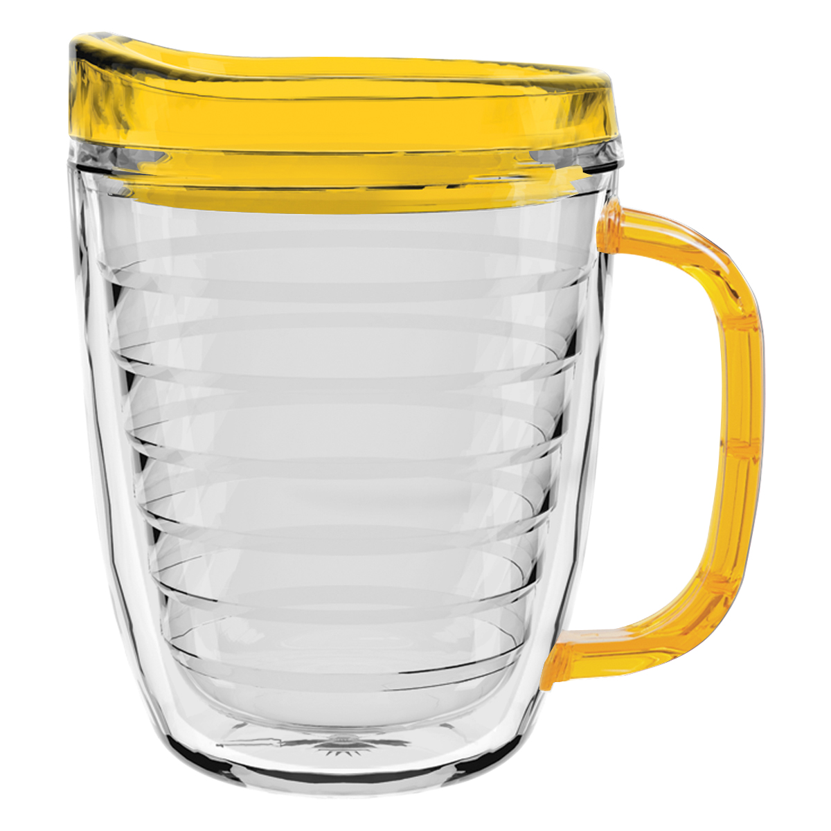 Clear Mug with Translucent: Clear, Charcoal, Orange, Purple, Blue, Green, Red, Lime Green, Yellow, Navy, Fuchsia, Mocha or Dark Green Lid and Handles.