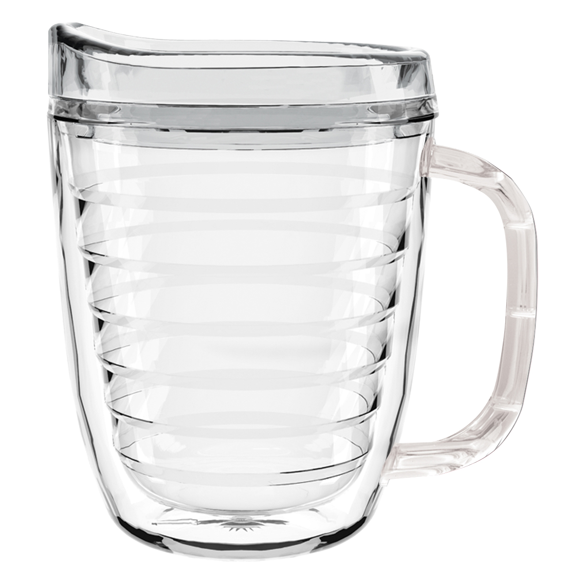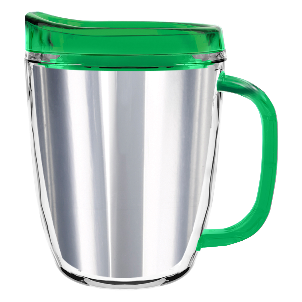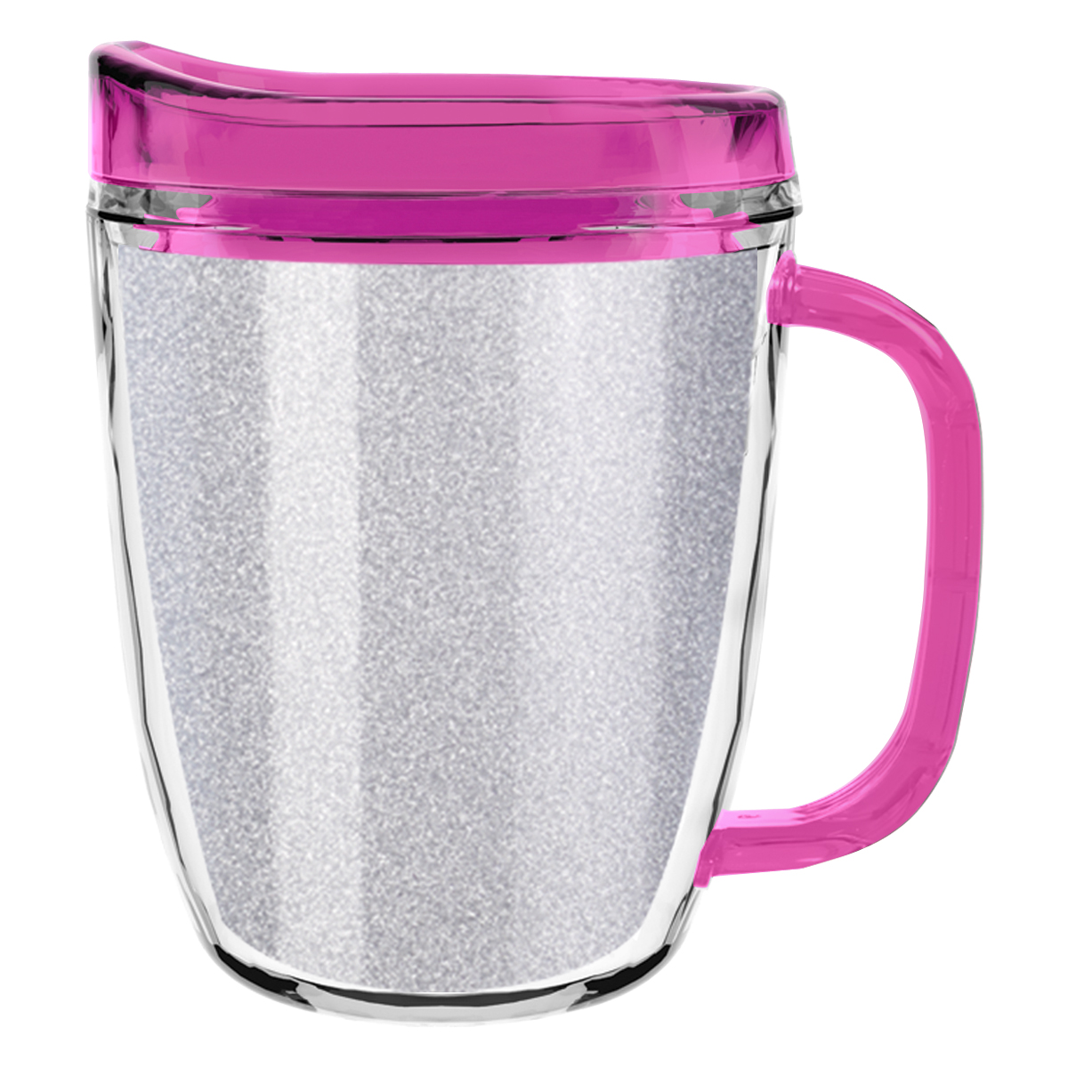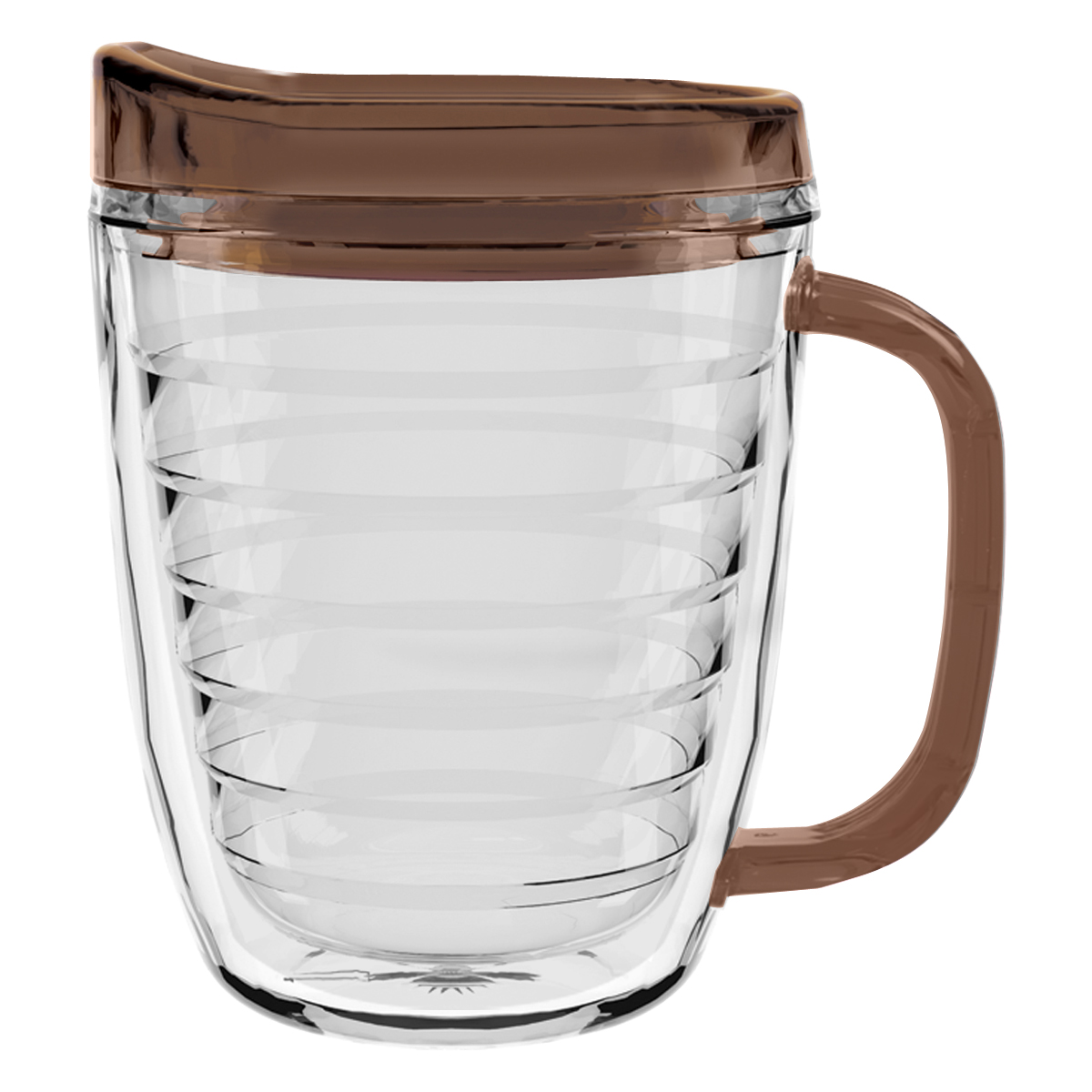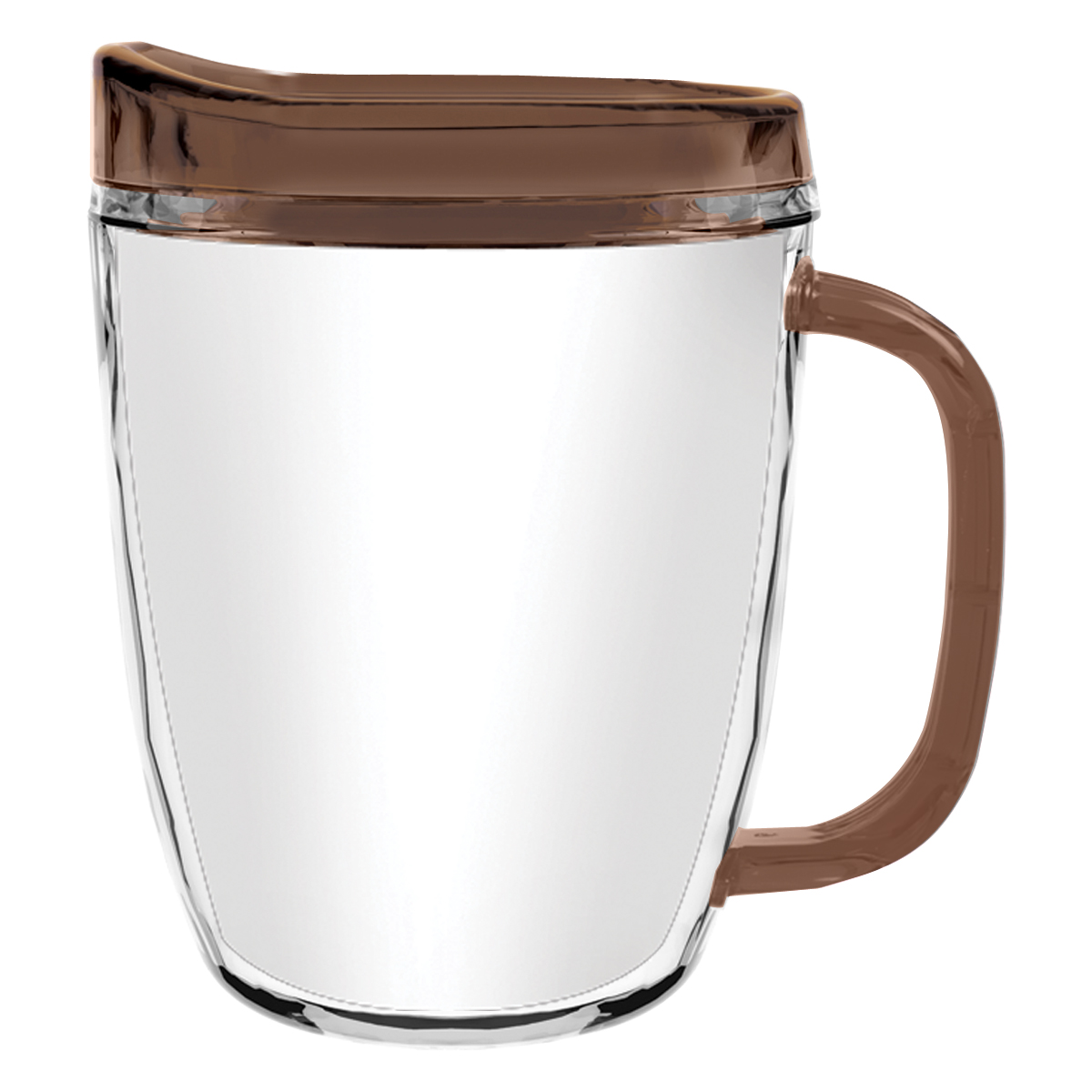 Clear Mug with Translucent: Clear, Charcoal, Orange, Purple, Blue, Green, Red, Lime Green, Yellow, Navy, Fuchsia, Mocha or Dark Green Lid and Handles.