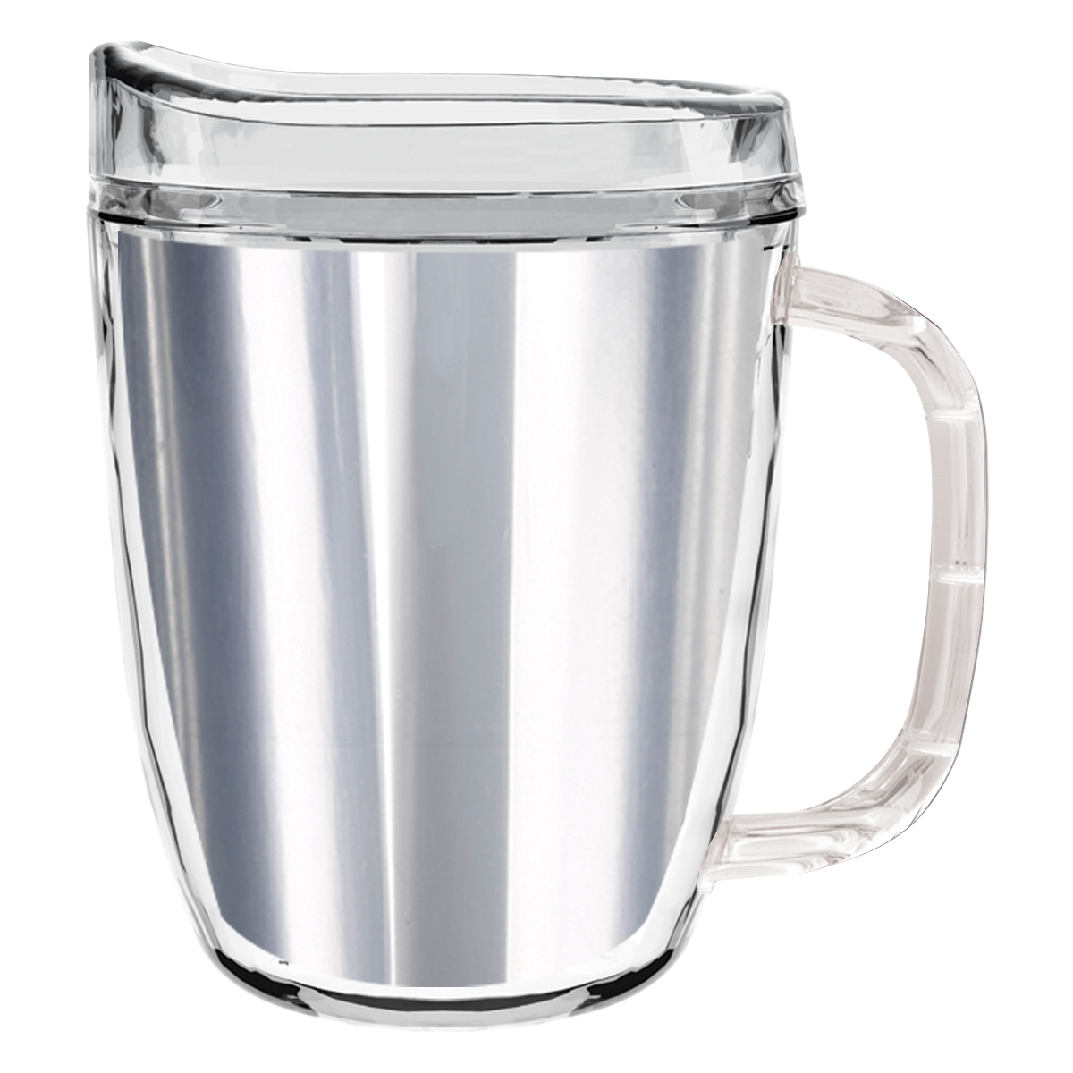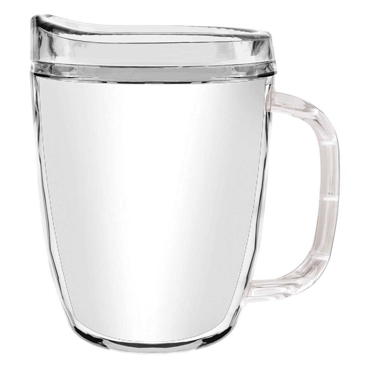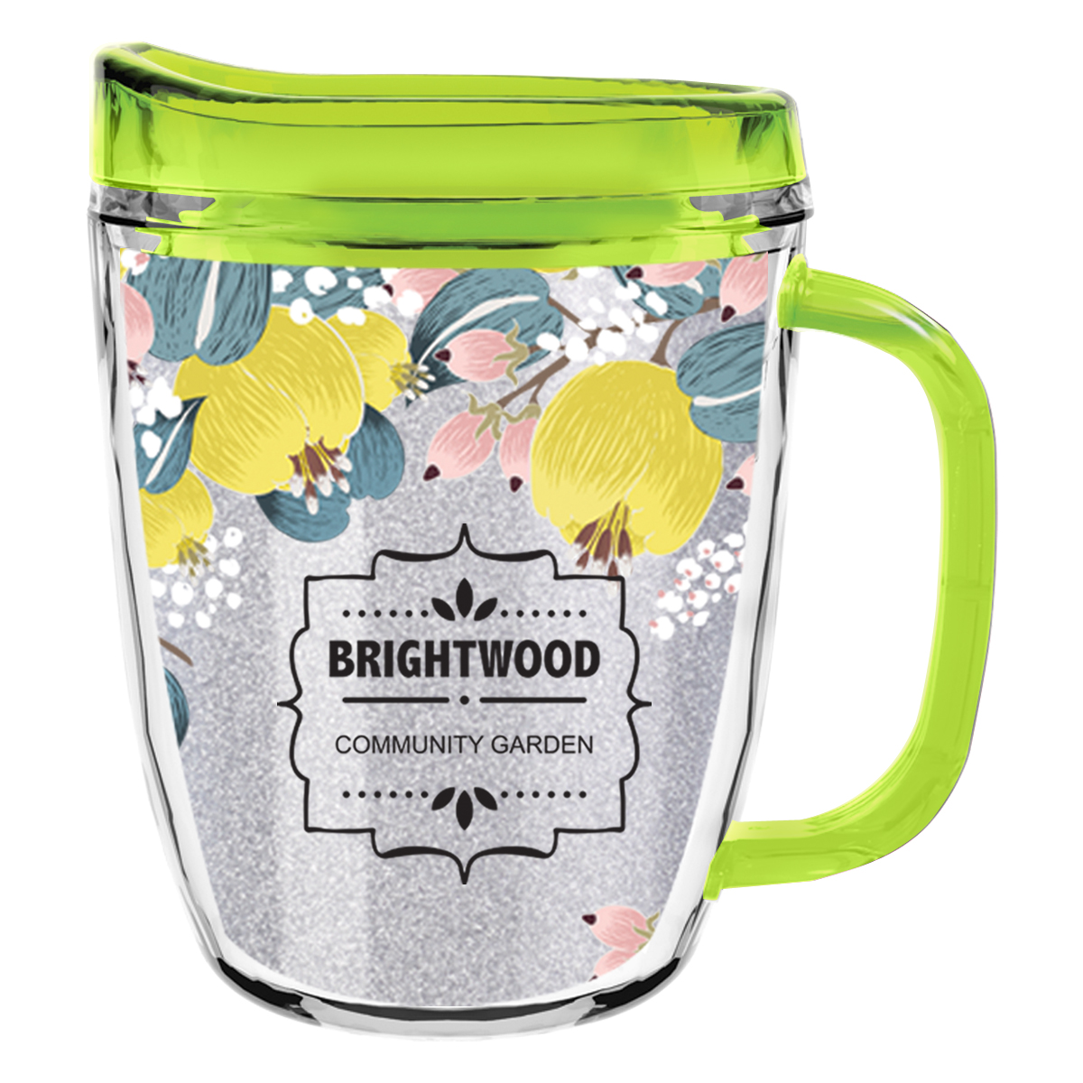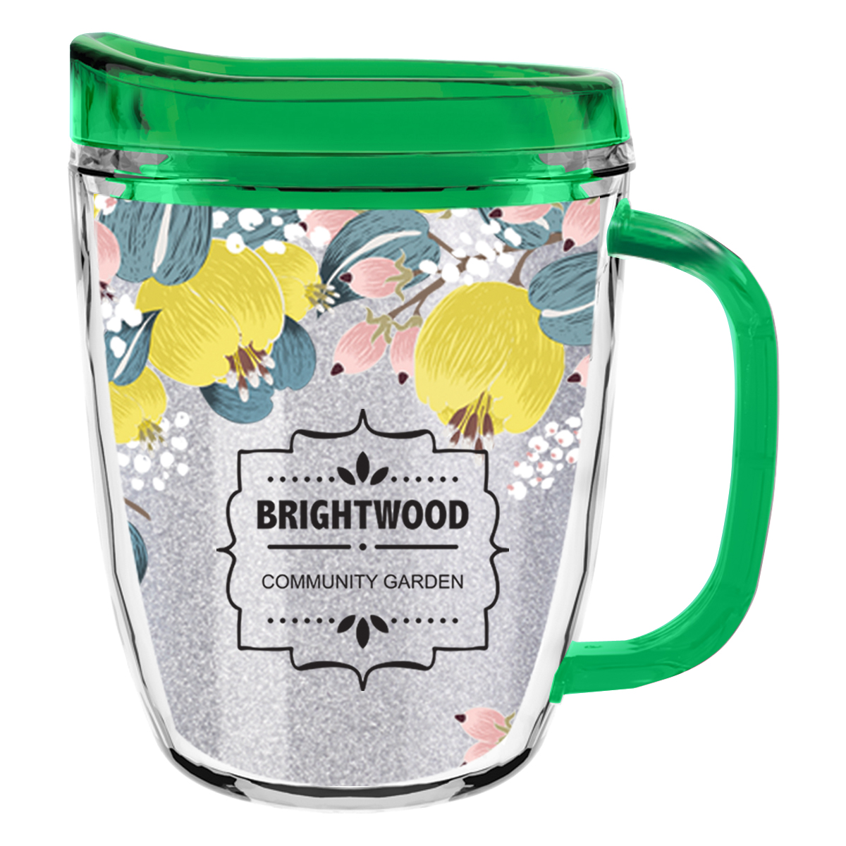 Clear Mug with Translucent: Clear, Charcoal, Orange, Purple, Blue, Green, Red, Lime Green, Yellow, Navy, Fuchsia, Mocha or Dark Green Lid and Handles.
