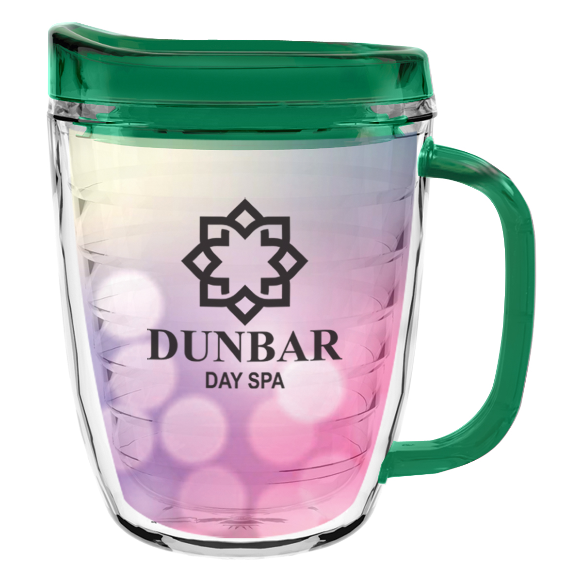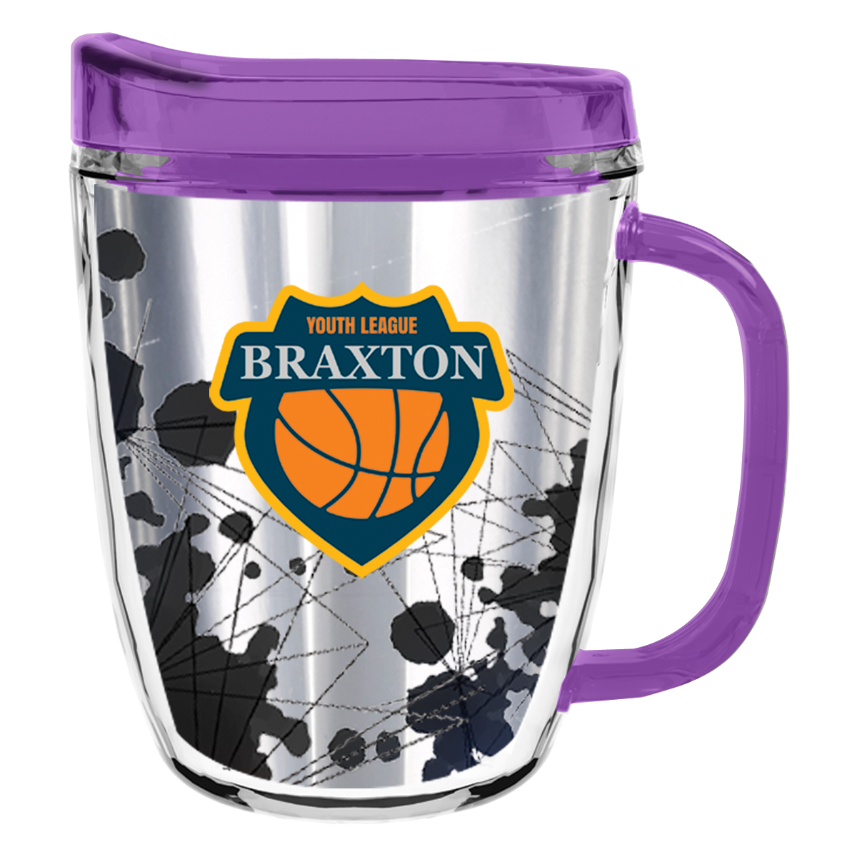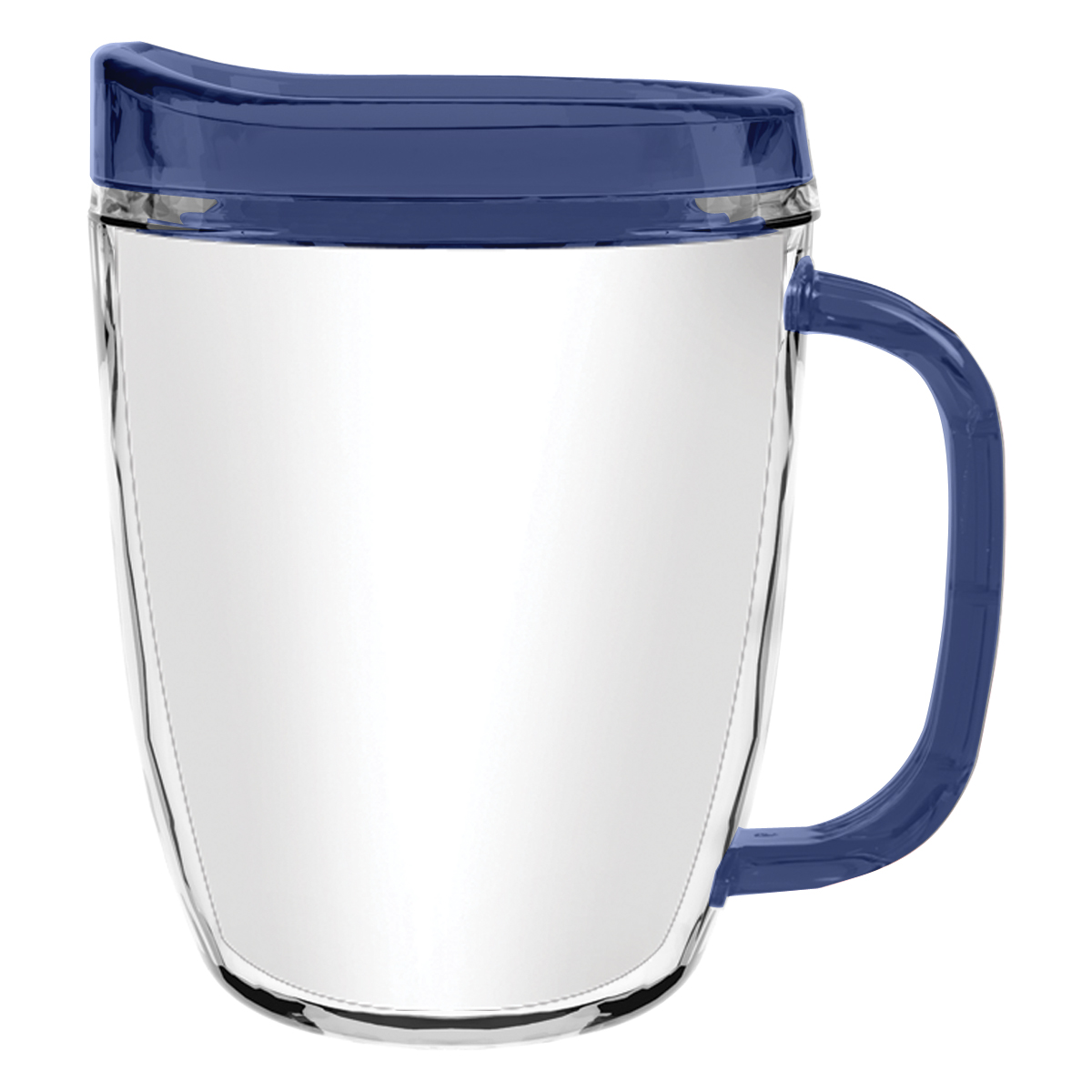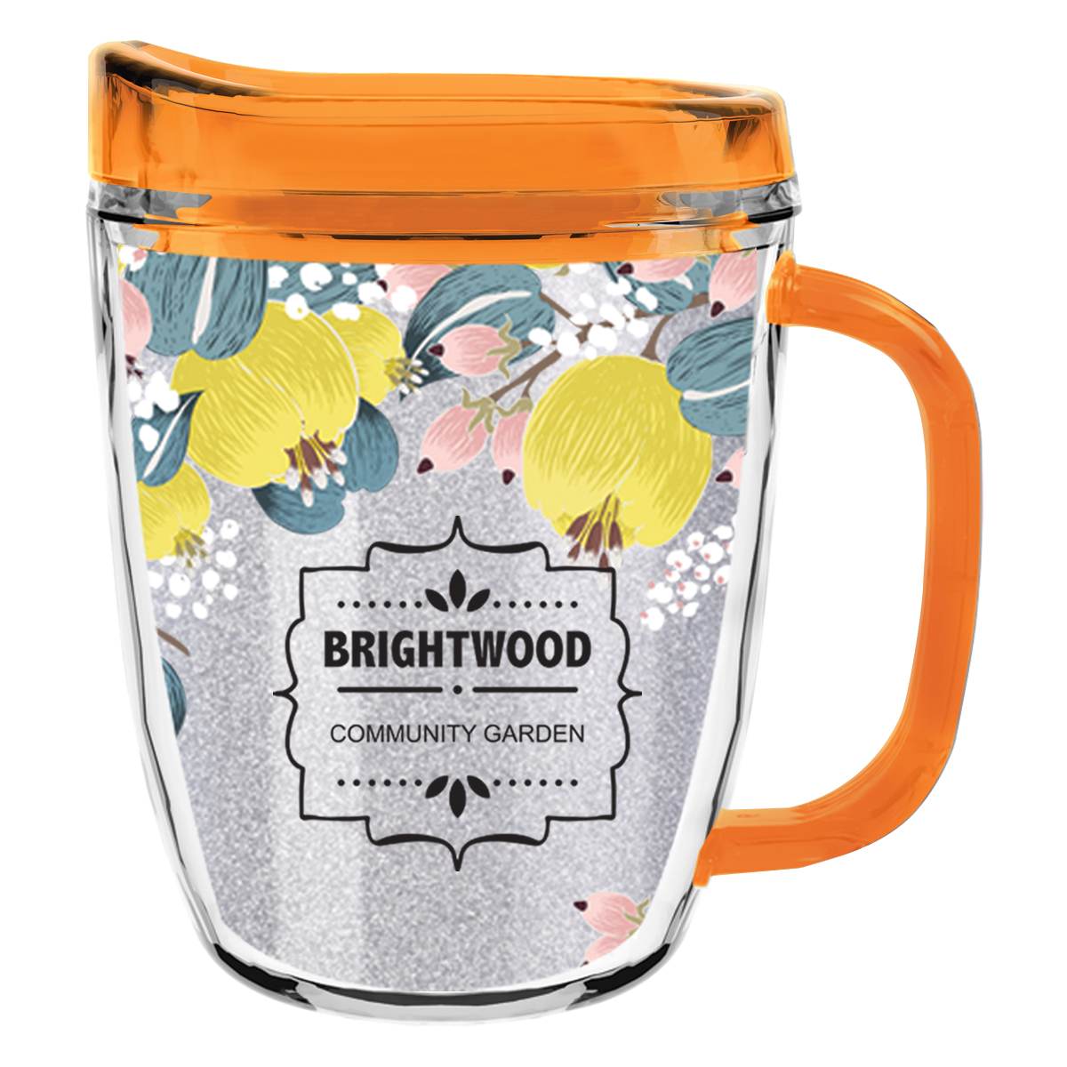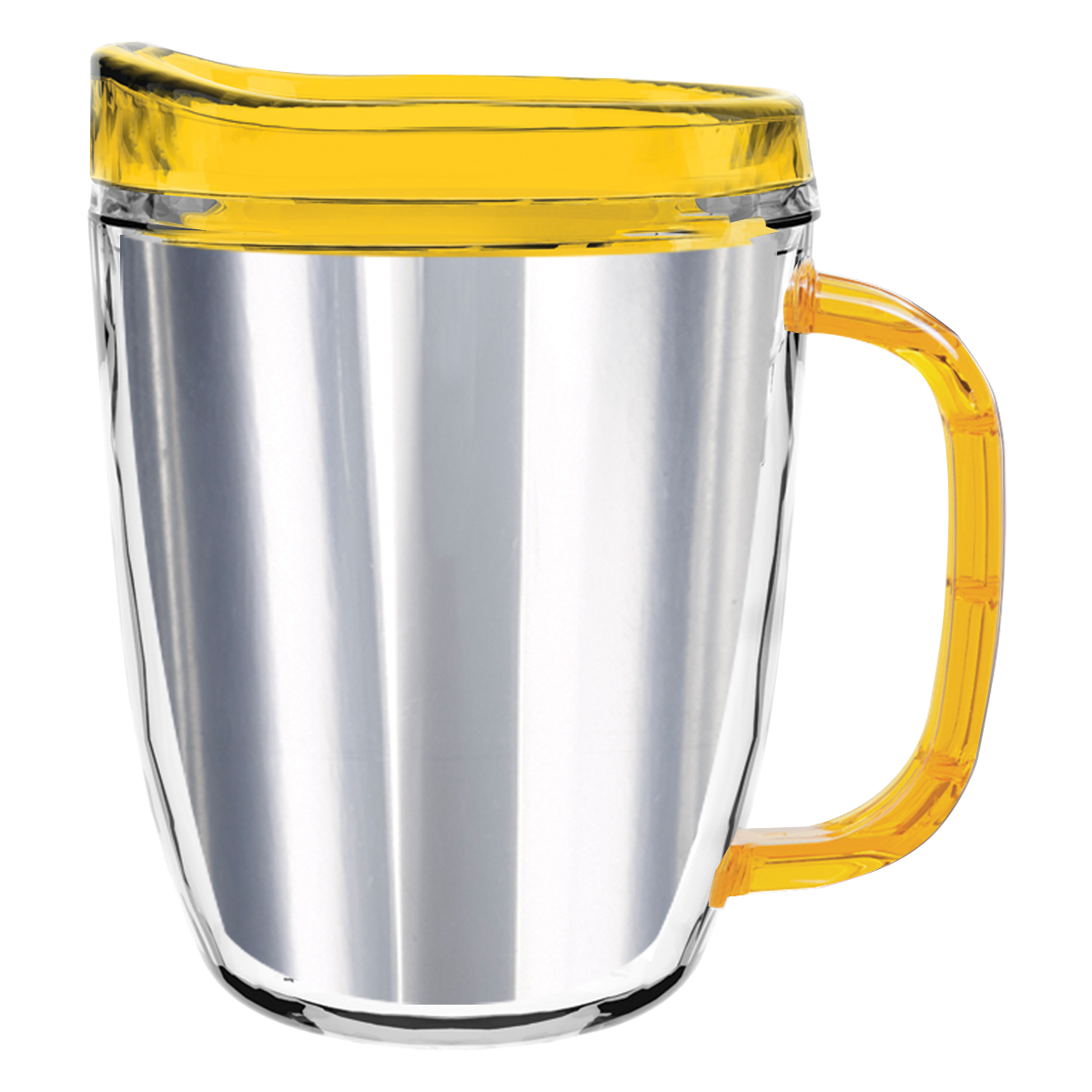 Clear Mug with Translucent: Clear, Charcoal, Orange, Purple, Blue, Green, Red, Lime Green, Yellow, Navy, Fuchsia, Mocha or Dark Green Lid and Handles.