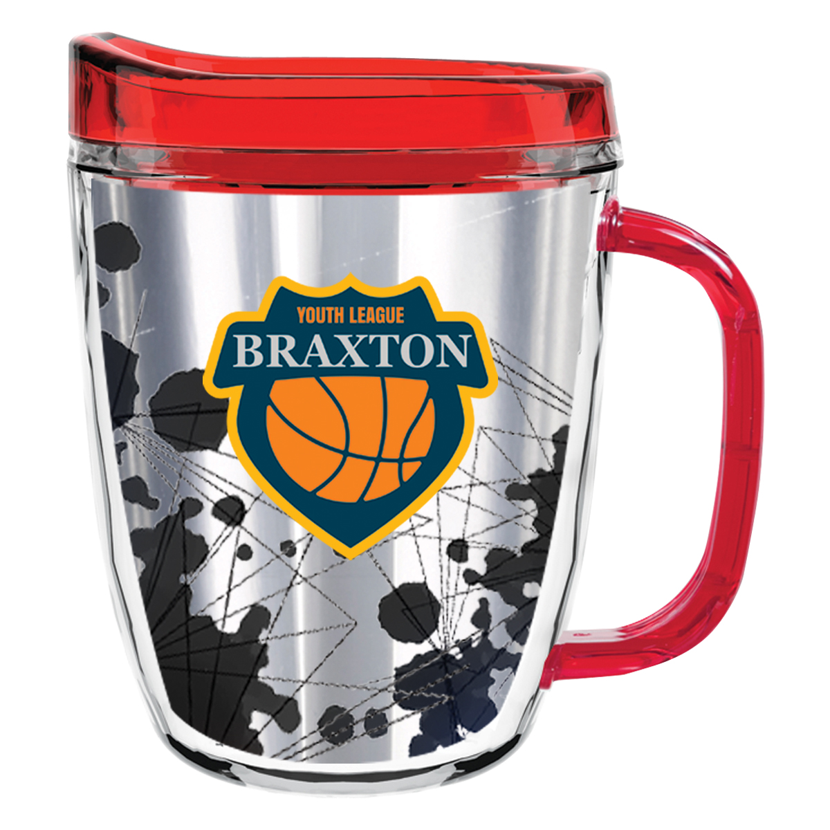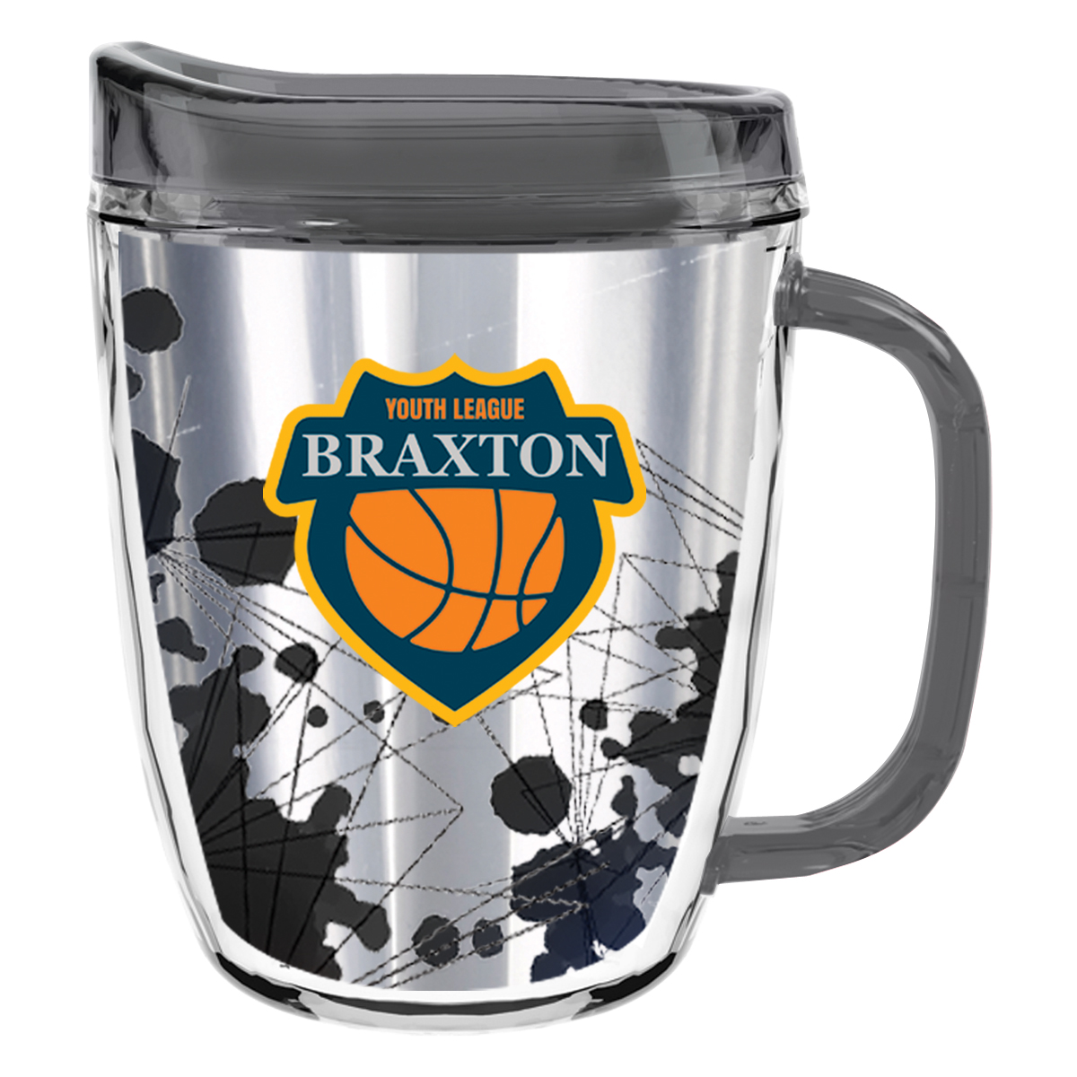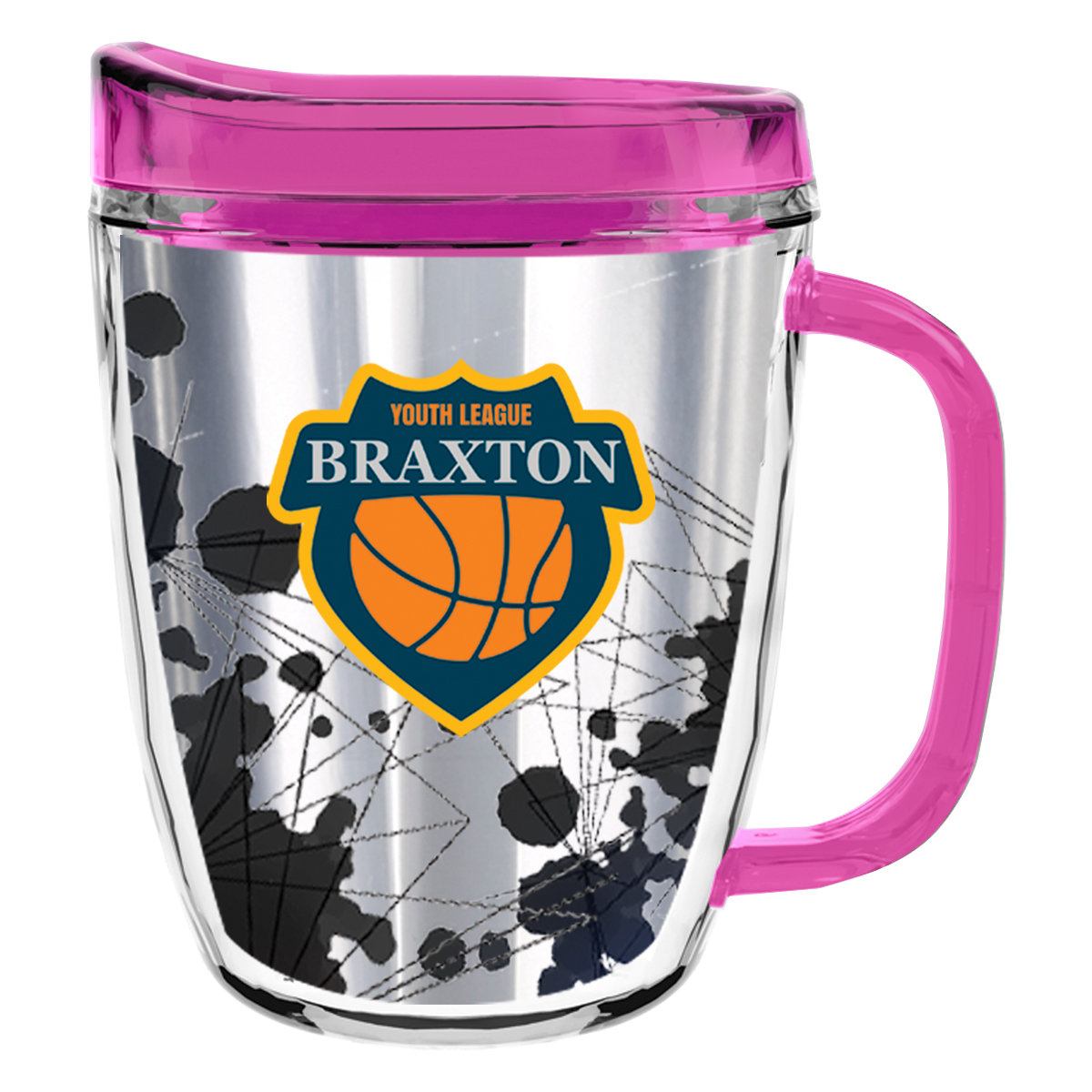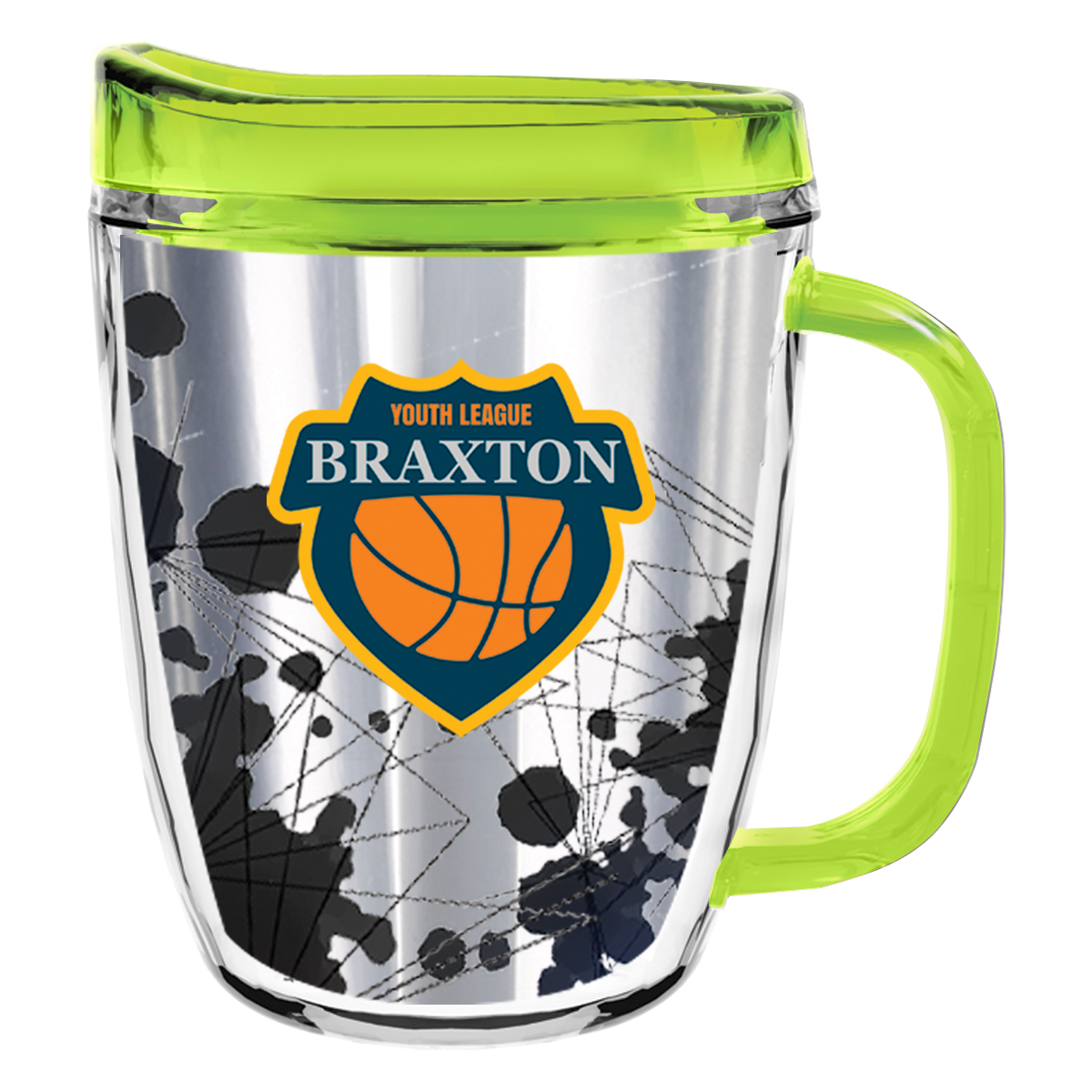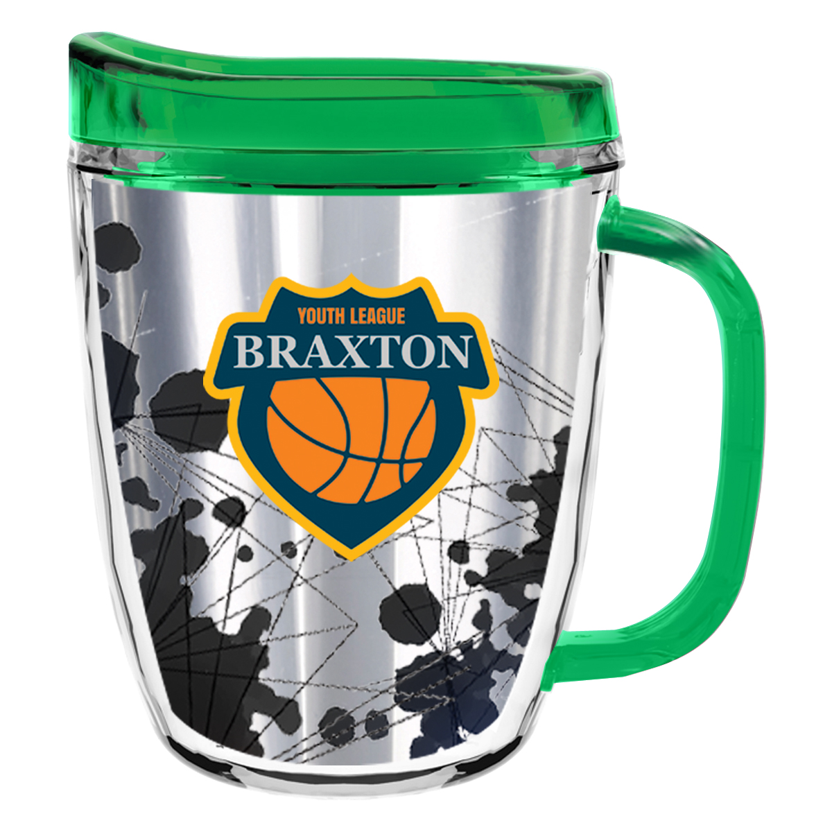 Clear Mug with Translucent: Clear, Charcoal, Orange, Purple, Blue, Green, Red, Lime Green, Yellow, Navy, Fuchsia, Mocha or Dark Green Lid and Handles.