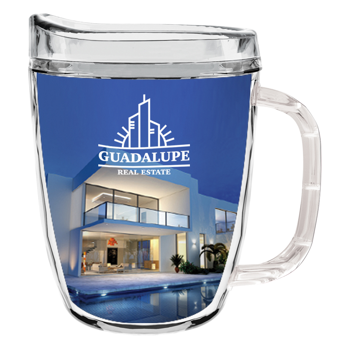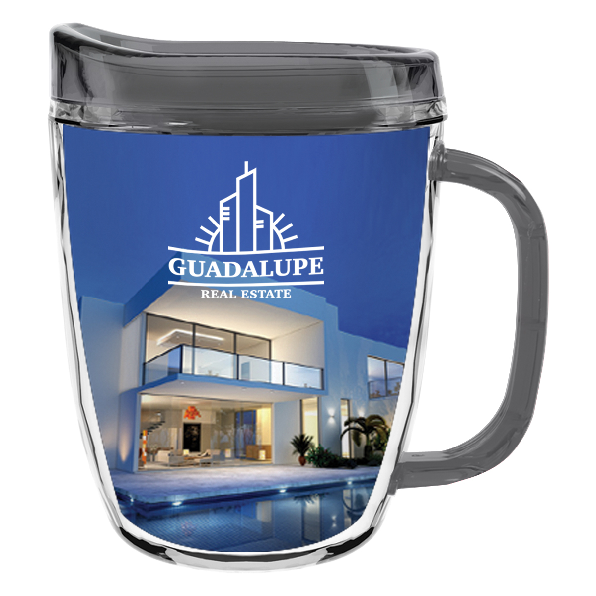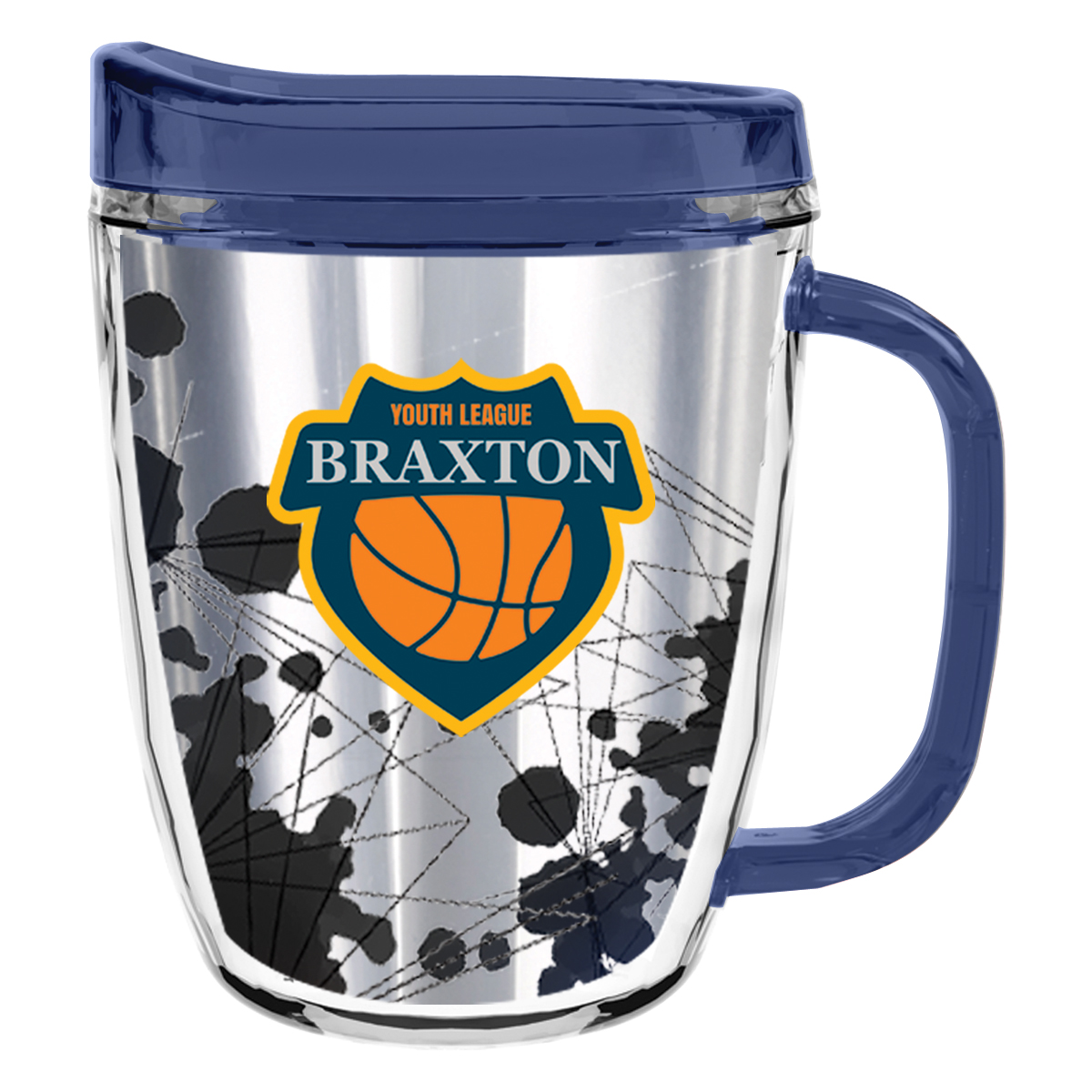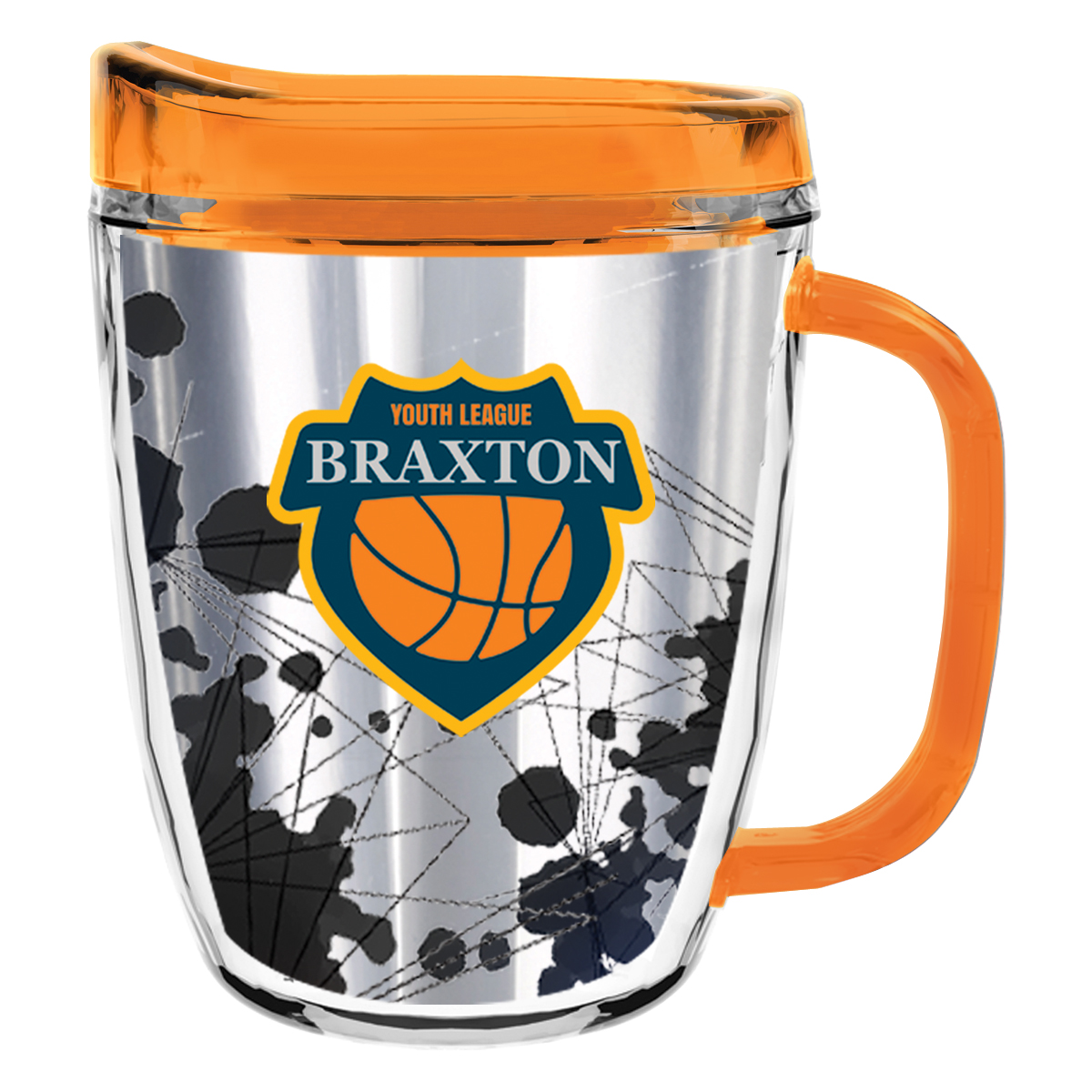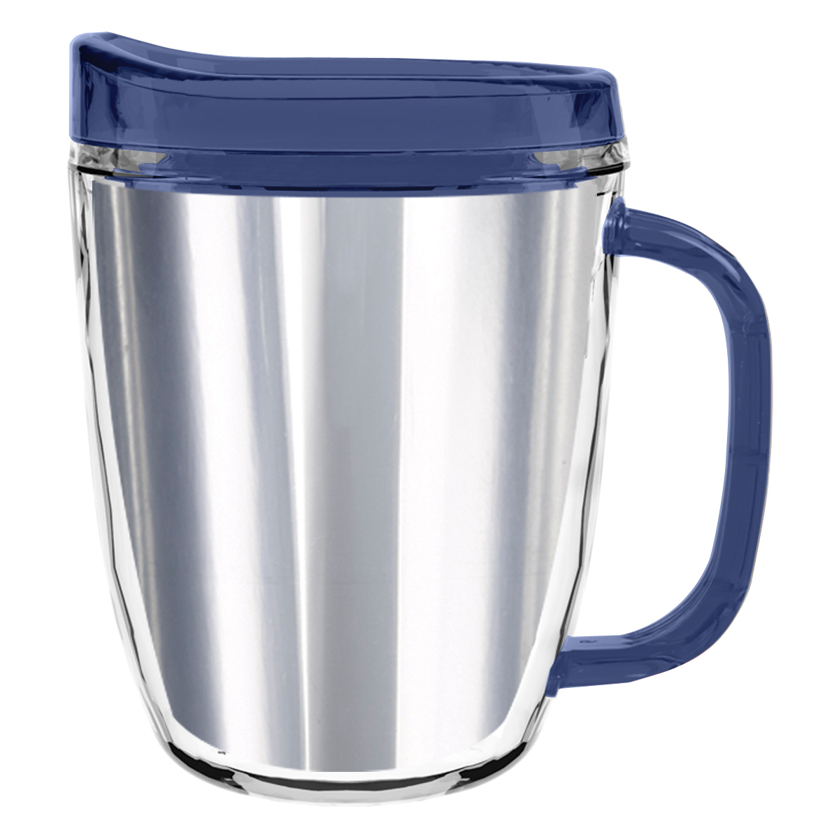 Clear Mug with Translucent: Clear, Charcoal, Orange, Purple, Blue, Green, Red, Lime Green, Yellow, Navy, Fuchsia, Mocha or Dark Green Lid and Handles.