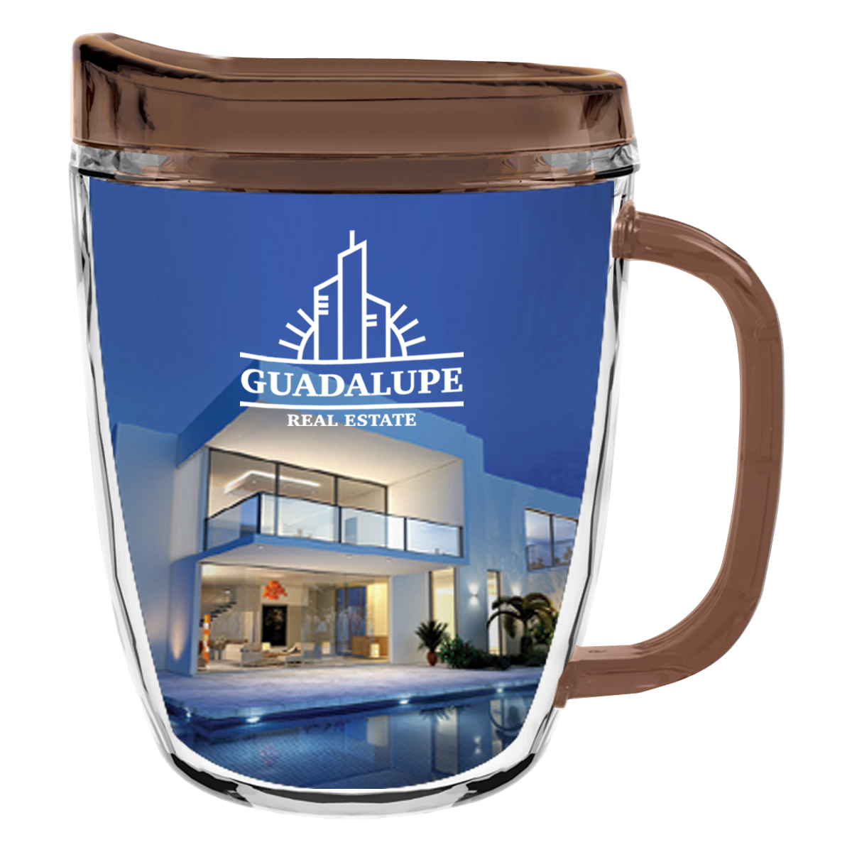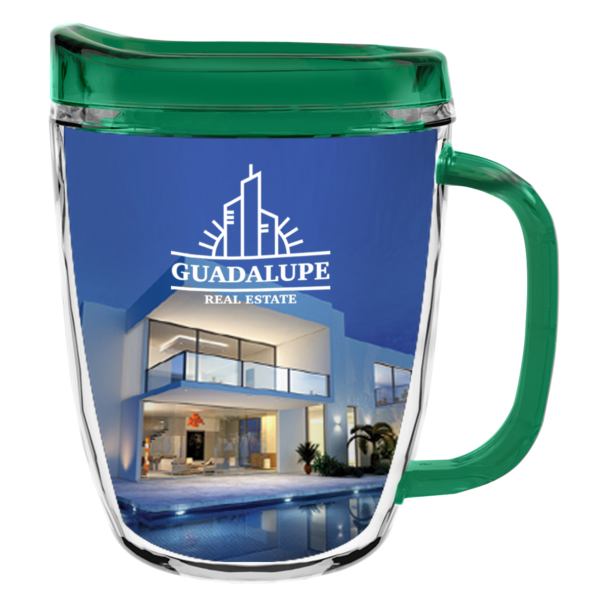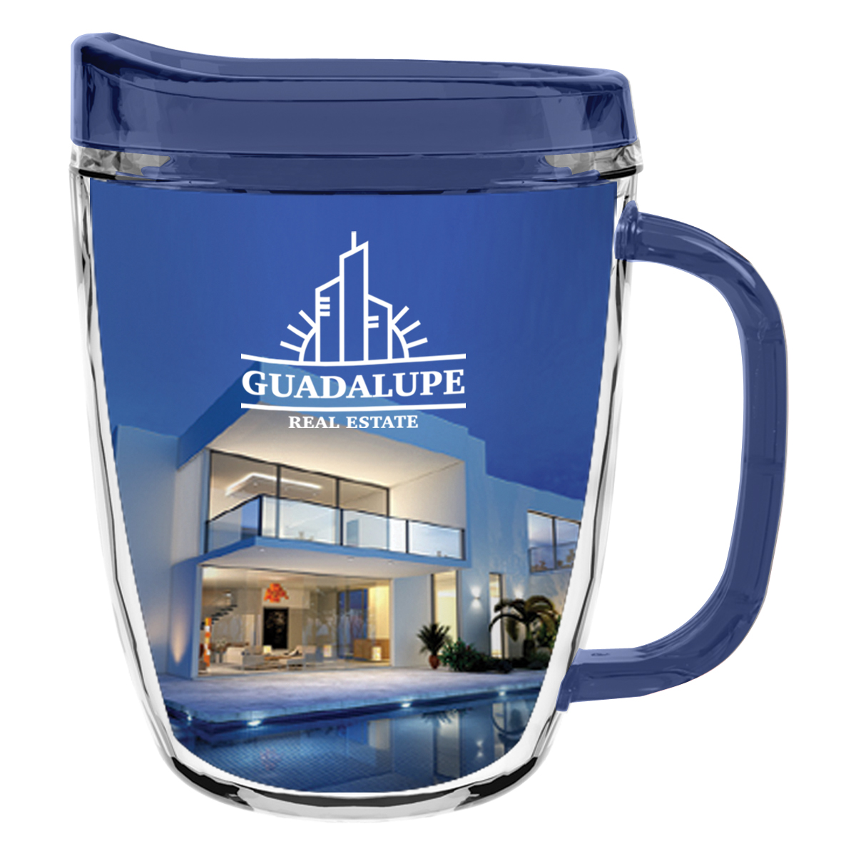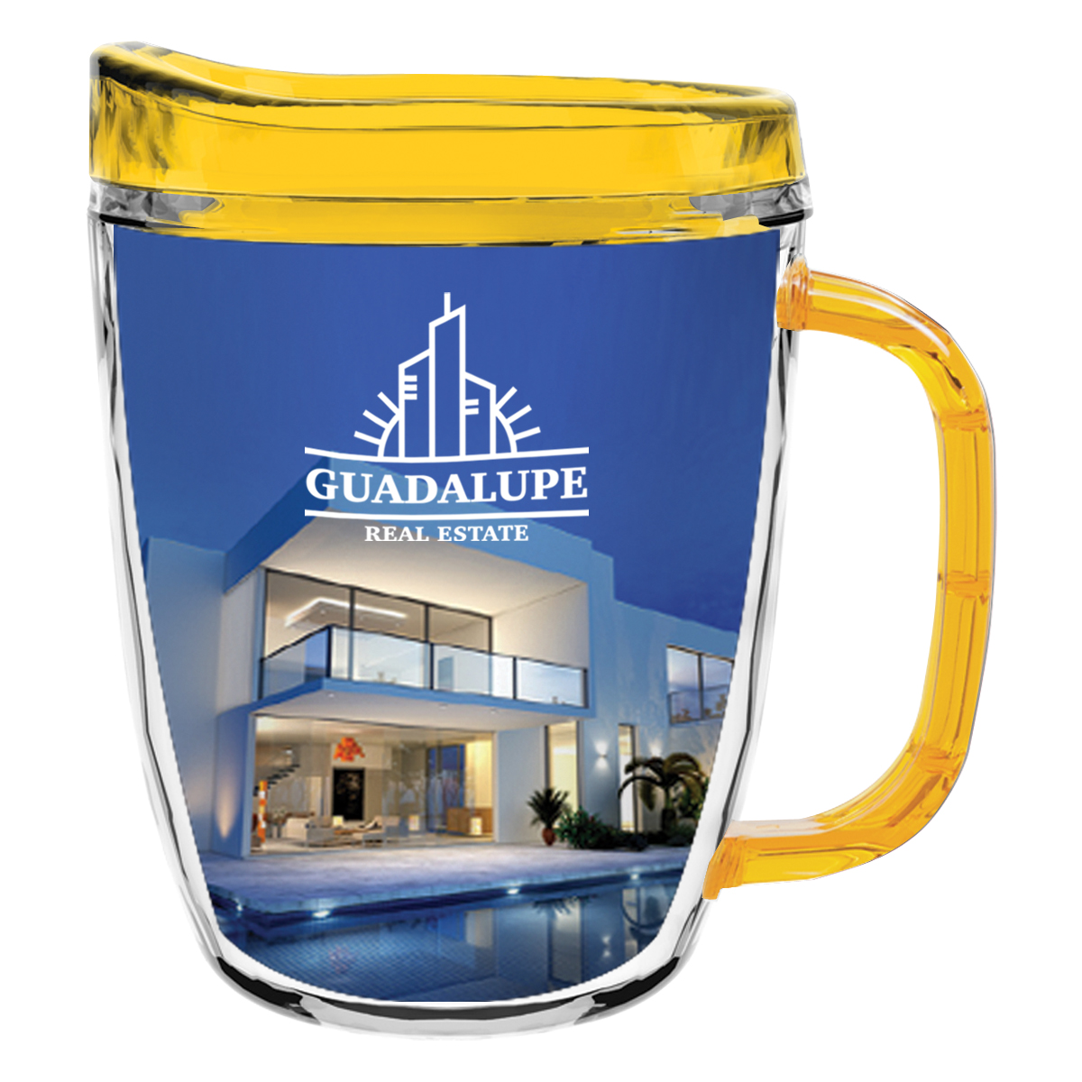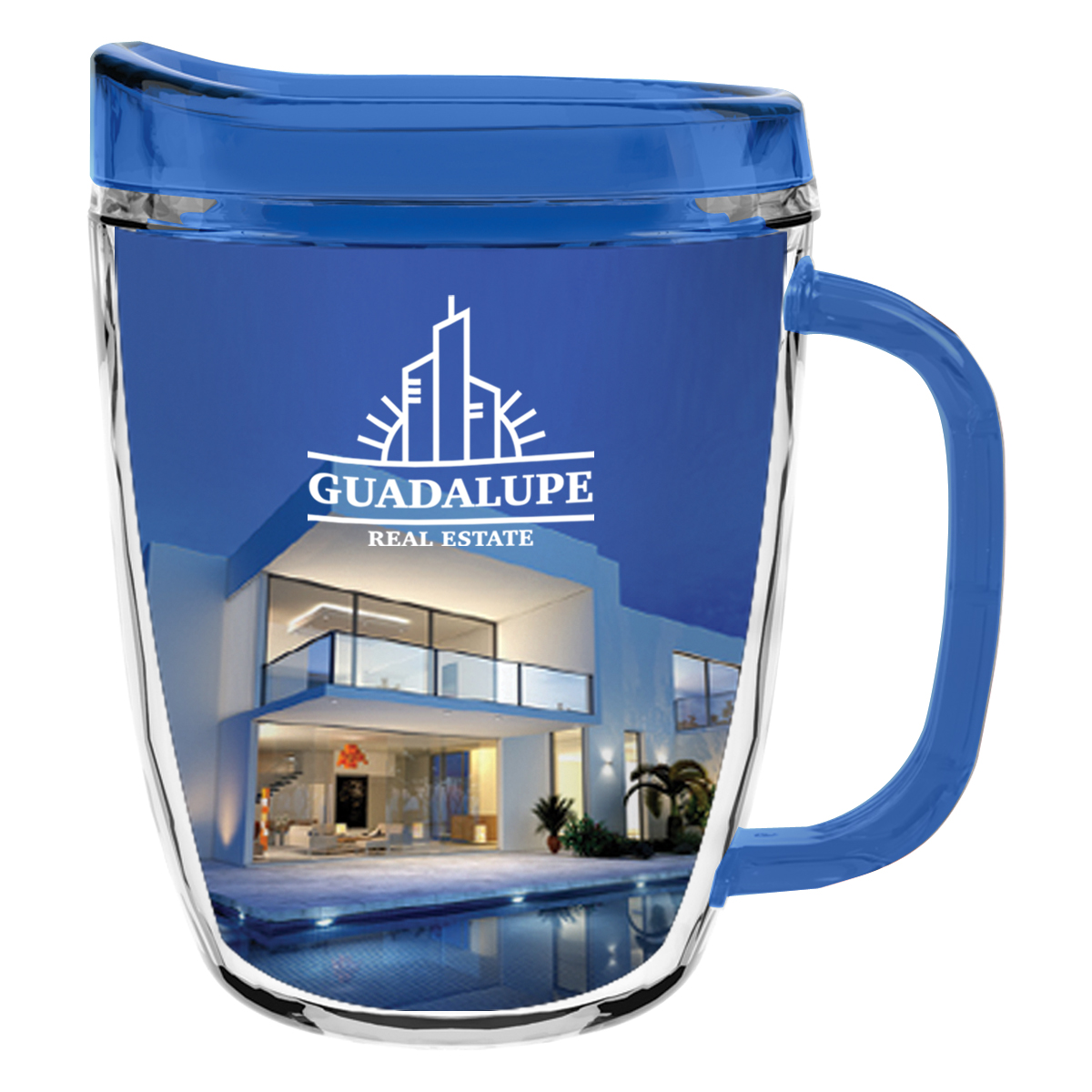 Clear Mug with Translucent: Clear, Charcoal, Orange, Purple, Blue, Green, Red, Lime Green, Yellow, Navy, Fuchsia, Mocha or Dark Green Lid and Handles.