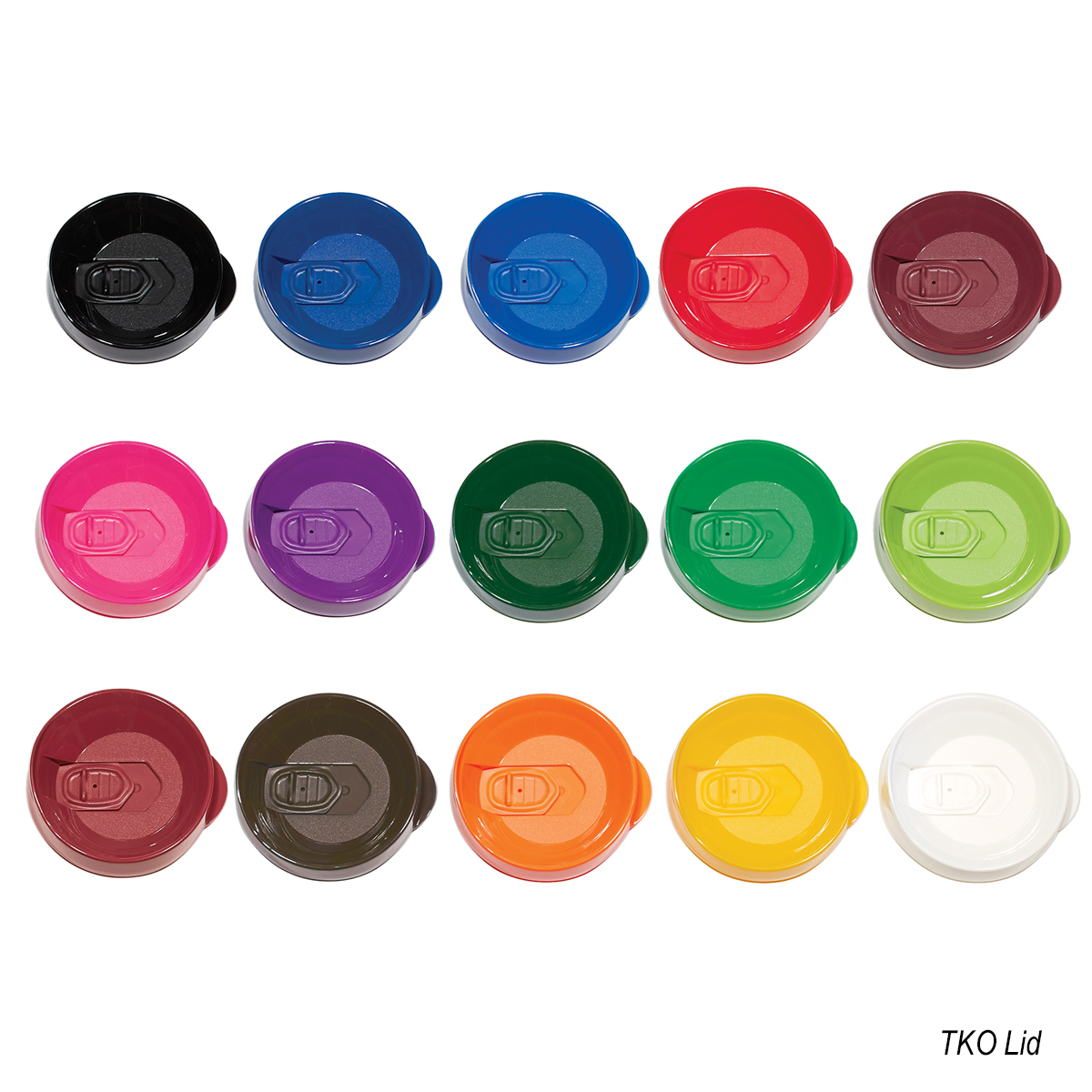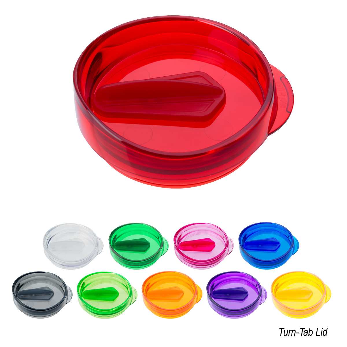 Optional Turn Tab Lid: $1.50(G) per piece. Lids are available in Translucent: Pink, Orange, Blue, Green, Red, Purple, Yellow, Lime Green, Charcoal or Clear. Optional TKO Lid: $1.20(G) per piece. Lids are available in Black, Blue, Brown, Fuchsia, Dark Green, Green, Lime Green, Crimson, Maroon, Navy, Orange, Purple, Red, White or Yellow.