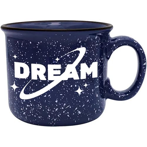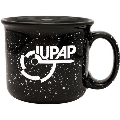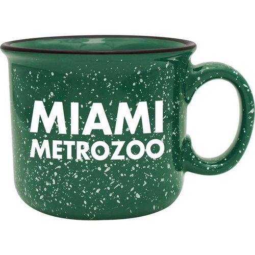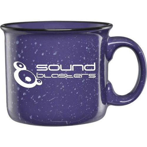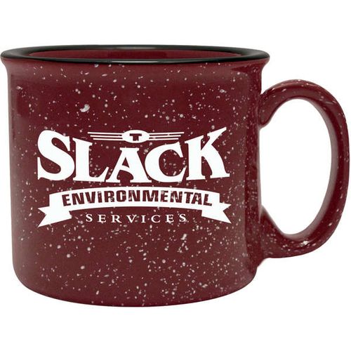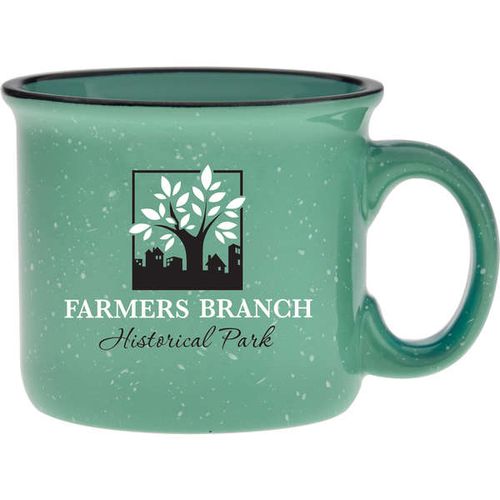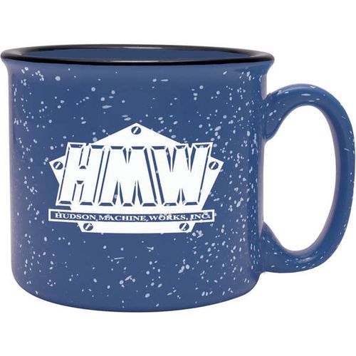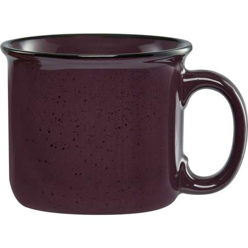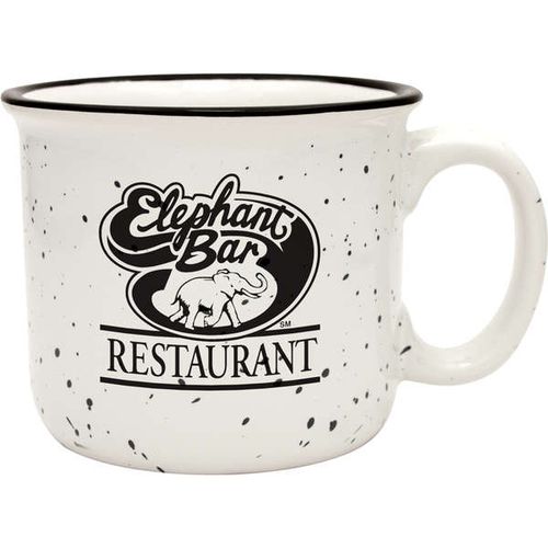 • 14 oz. Camper Mug - Features a speckled glaze and a black halo around the rim. Solid and sturdy design with long-lasting durability.