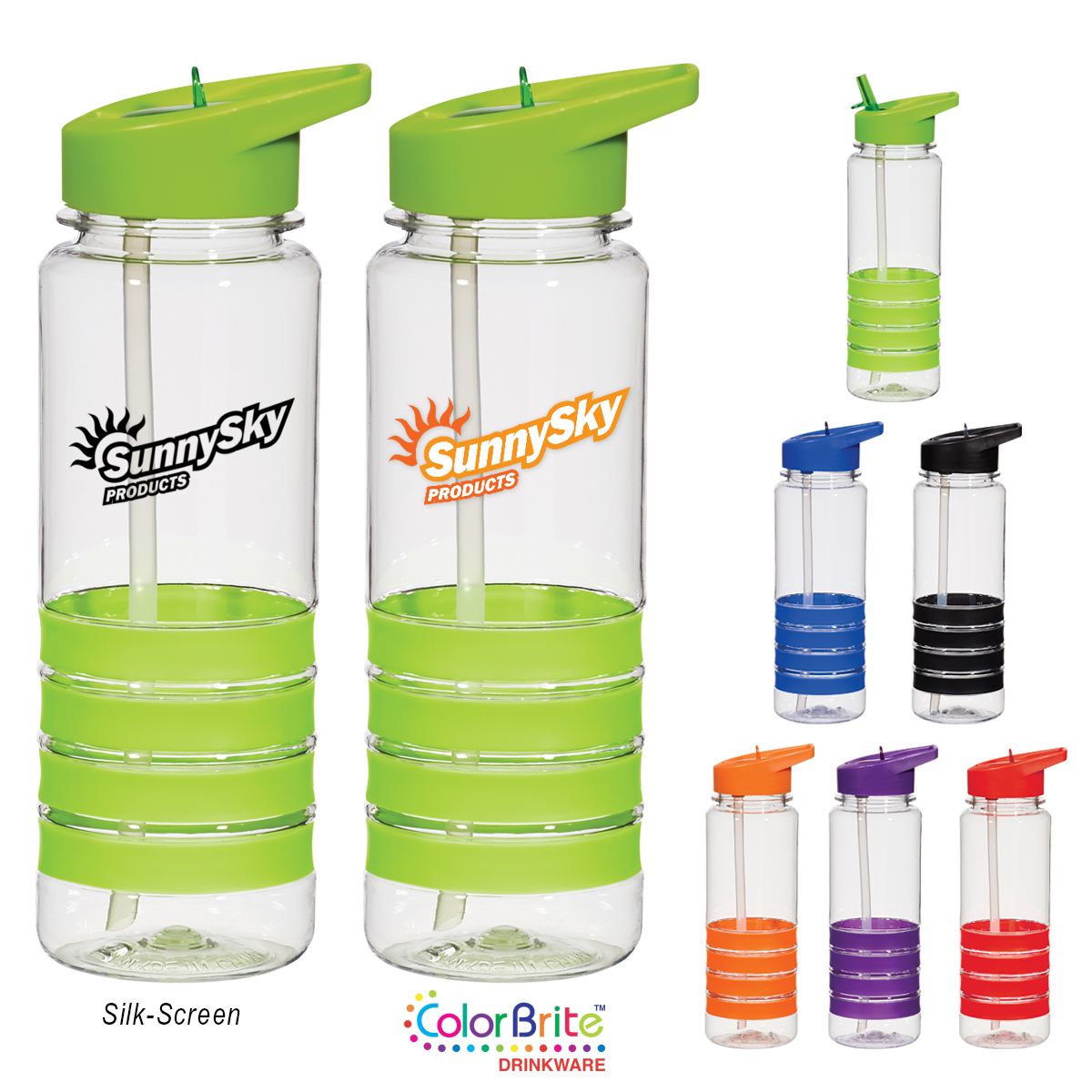 Clear with Blue, Red, Lime Green, Purple, Orange or Black Lid and Grip.