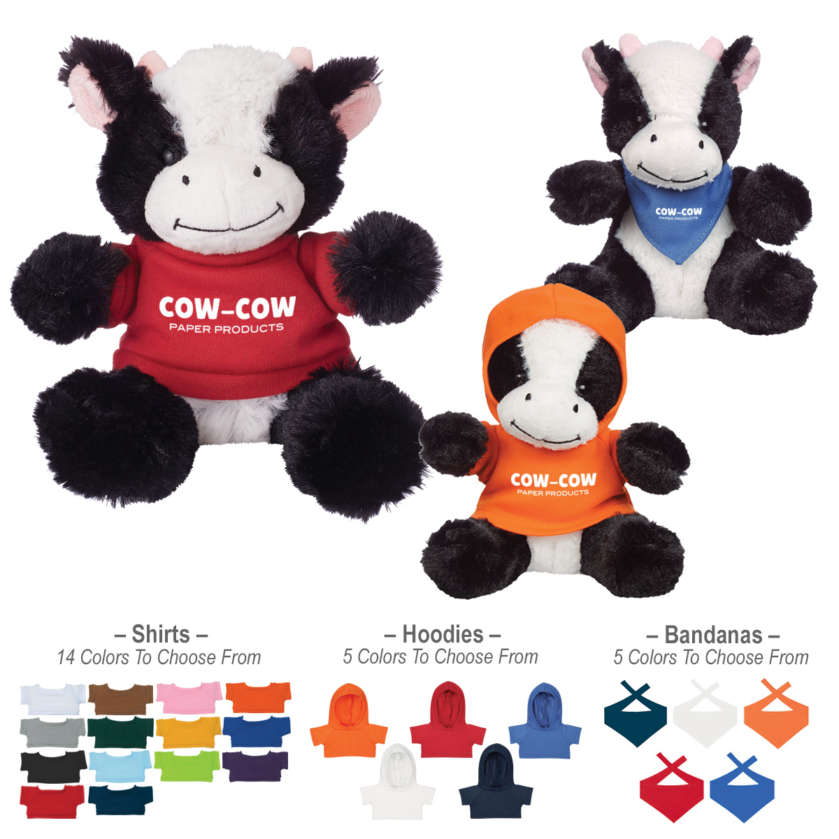 Cow: Black/White. Shirt: White, Royal Blue, Black, Forest Green, Pink, Athletic Gold, Light Blue, Orange, Heather Gray, Purple, Red, Lime Green, Navy or Brown. Bandana or Hoodie: Navy, Orange, Red, Royal Blue or White. (Must Specify On PO)