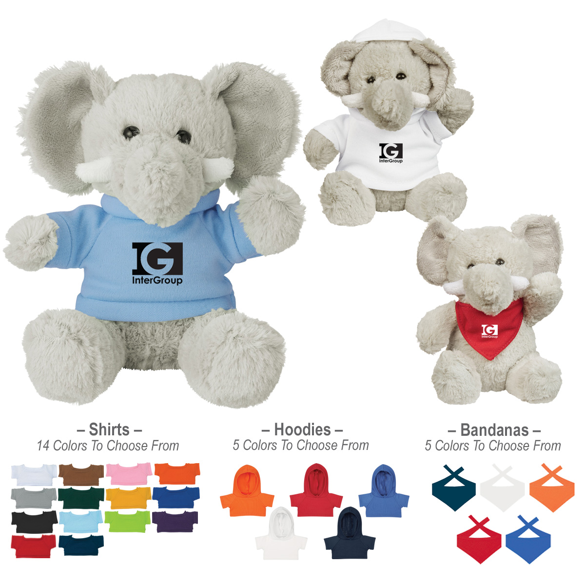 Elephant: Gray. Shirt: White, Royal Blue, Black, Forest Green, Pink, Athletic Gold, Light Blue, Orange, Heather Gray, Purple, Red, Lime Green, Navy or Brown. Bandana or Hoodie: Navy, Orange, Red, Royal Blue or White. (Must Specify On PO)