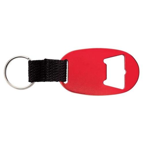 • Aluminum bottle opener keychain with web strap. Product Material: Aluminum; Polyester.