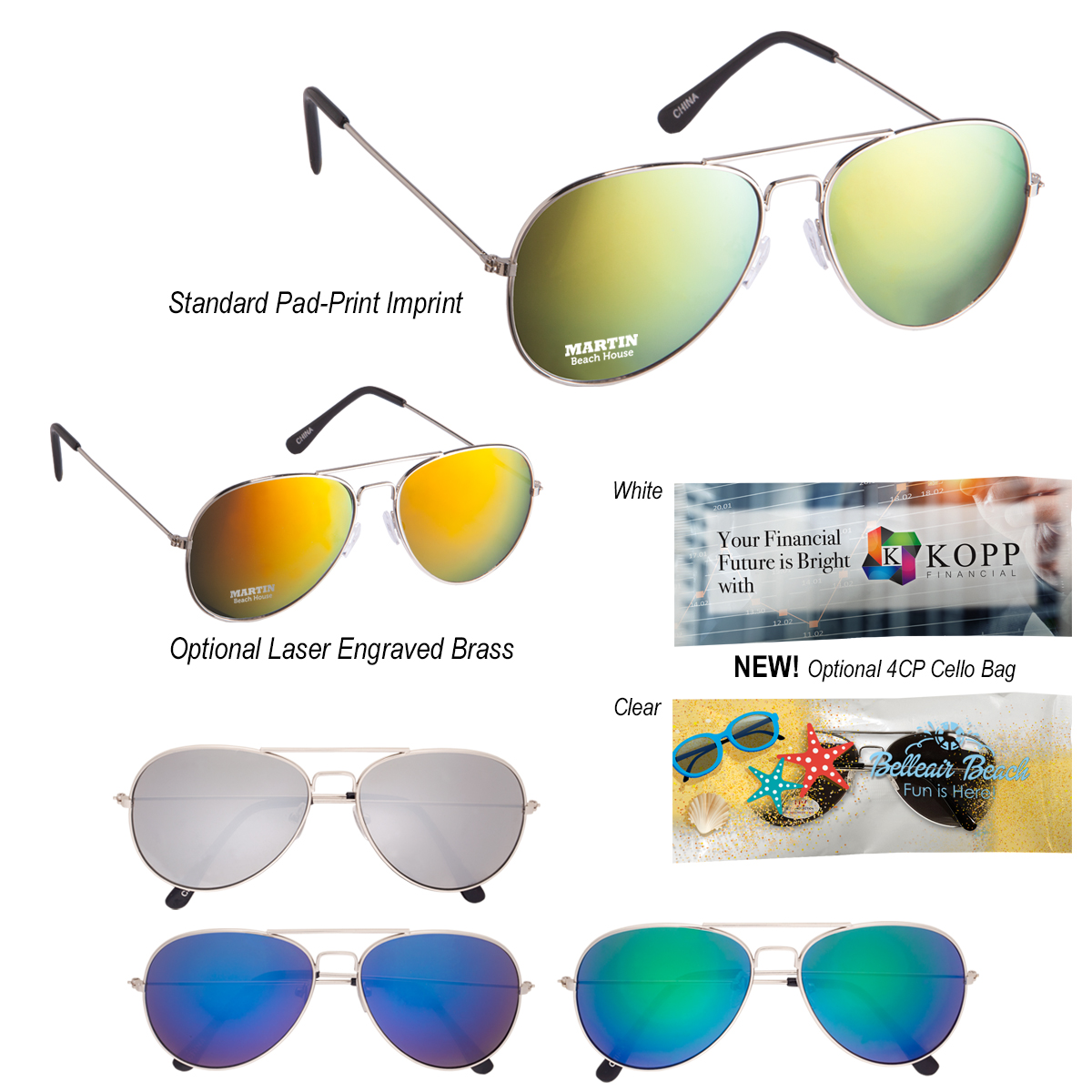 On Left Lens: Pad-Print: Add $40.00(G) set up plus .25(G) per piece. • Laser Engraved: Add $45.00(G) set up plus .25(G) per piece.