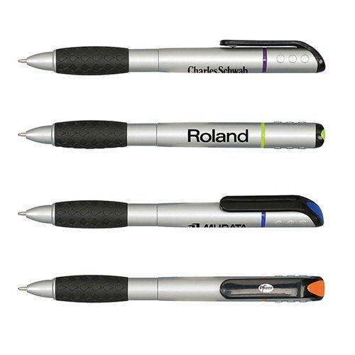 • Twist-action pen on one end and a cap-off highlighter on the other.