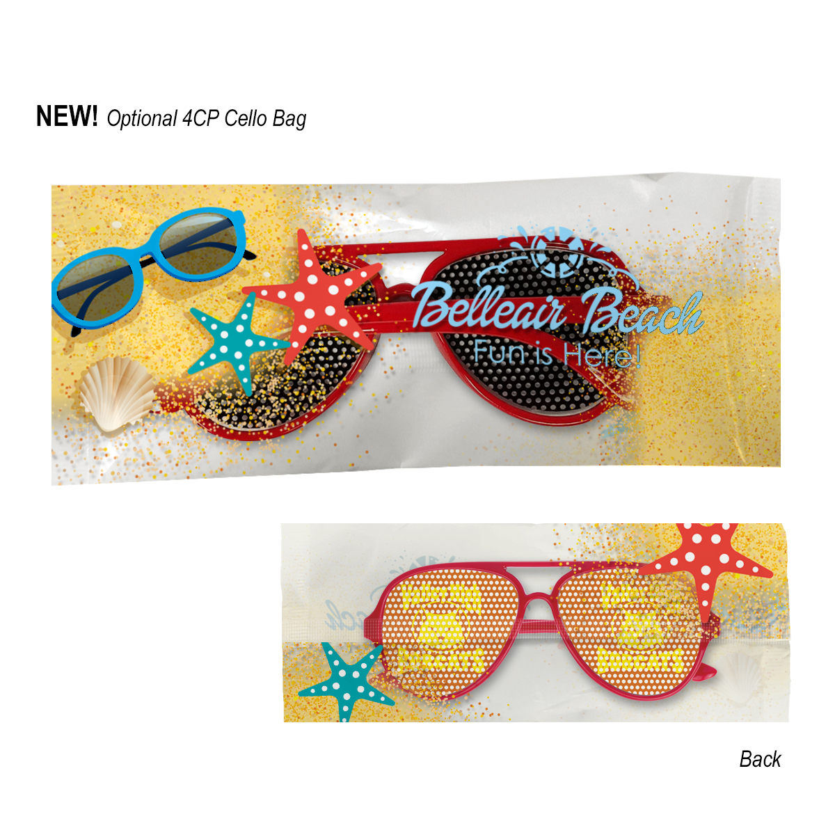 4CP Cello Bag: Add $50.00(G) set up charge plus .30(G) per piece. 4-color process on a white or clear cello bag. Must specify white or clear #4CPCELLO on PO. Choose from one of our stock designs or create your own custom design! 250 piece minimum. Production time for 4-Color Process Cello Bag is 5 to 7 days after proof approval.
