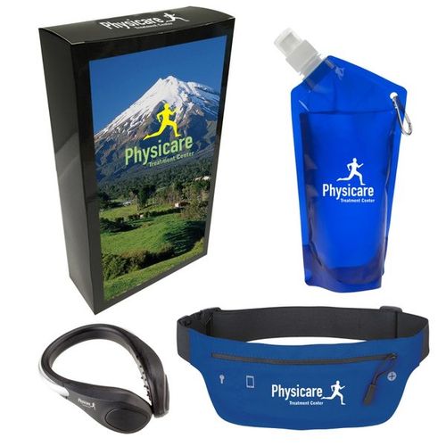 • Kit Contains: Safety Light Shoe Clip, Lycra Running Belt Fanny Pack, 28 Oz. Collapsible Bottle, and custom gift box.