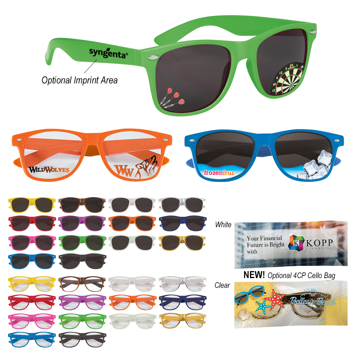 Yellow, White, Silver, Red, Gold, Orange, Pink, Blue, Black, Purple, Green, Navy or Woodtone. Sunglass or Clear Lens Available. Must Specify on Order. If Not Specified, Sunglass Will Be Used As Standard.