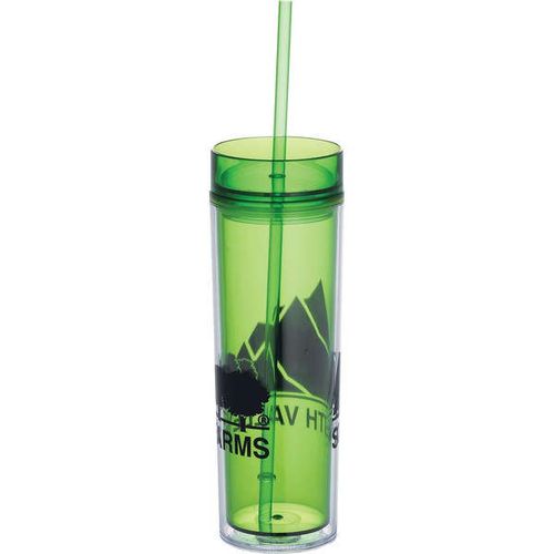 • This skinny double-wall acrylic tumbler comes with two lids.