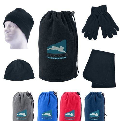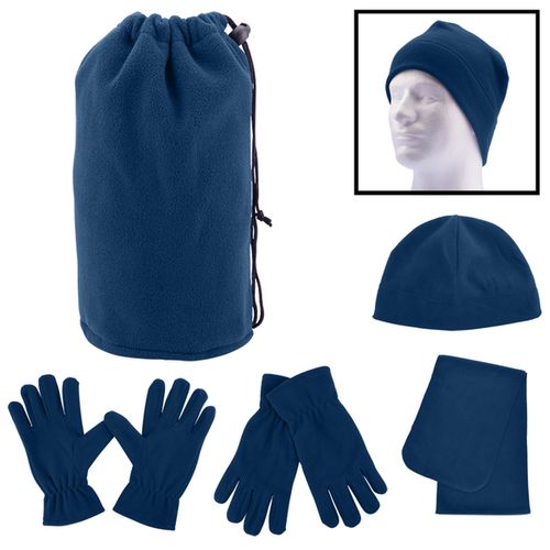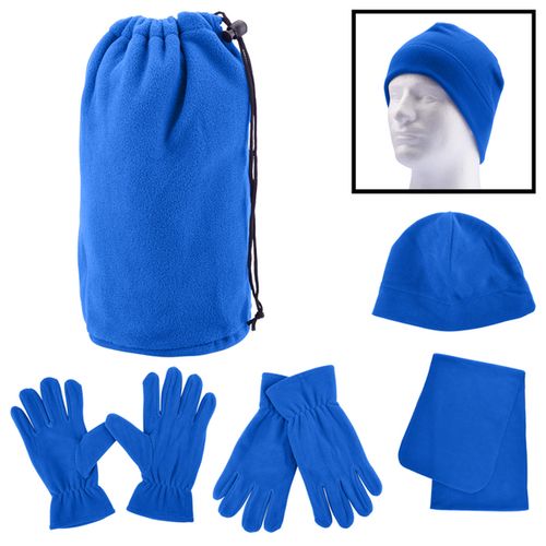 • 100% Polyester fleece (230 GSM) drawcord pouch packed with matching fleece hat, gloves and scarf.