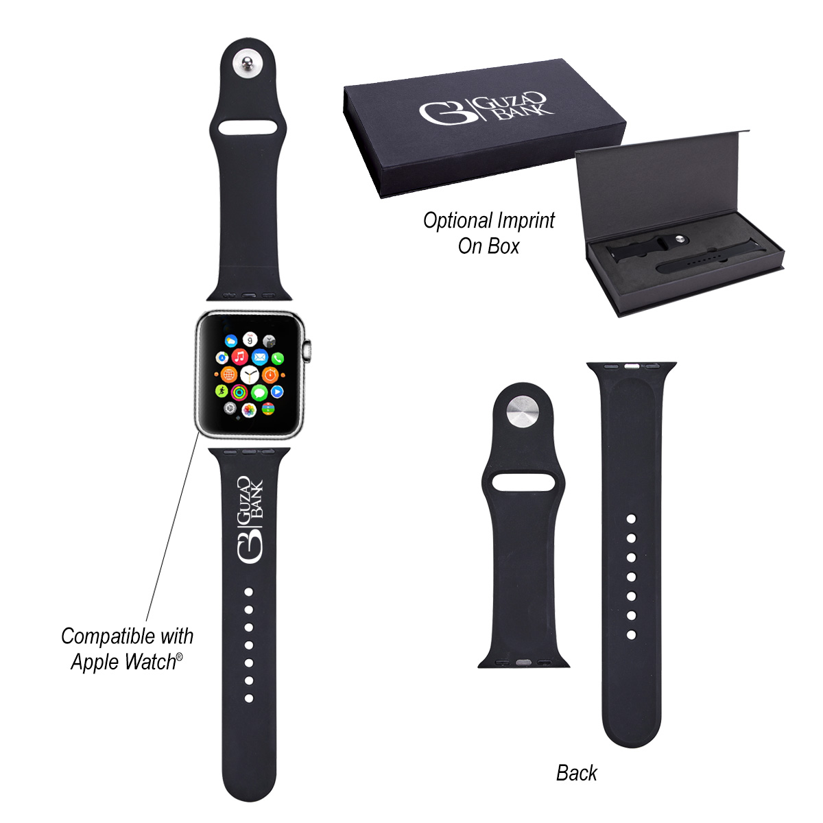 Standard on Band: Pad-Print: 1 ¼" W x ¼" H • Optional on Box: Silk-Screen or Digibrite: 6" W x 3" H
