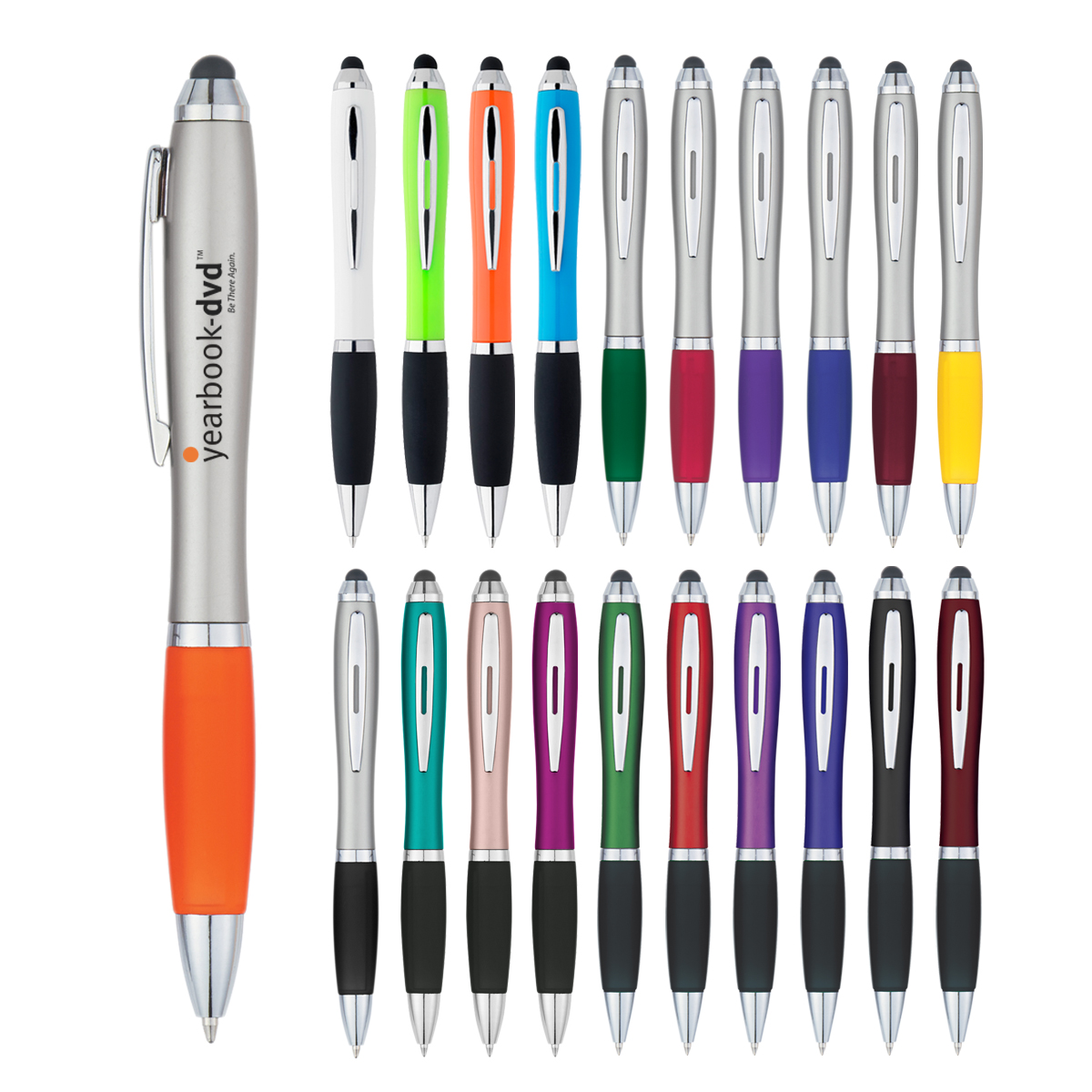 Satin Silver Barrel with Blue, Purple, Green, Yellow, Burgundy, Charcoal, Orange or Red Rubberized Grip. Light Blue, Lime Green, Orange, White, Red, Blue, Green, Purple, Black or Burgundy Barrel, all with Black Rubberized Grip. Metallic: Fuchsia, Rose Gold or Teal.