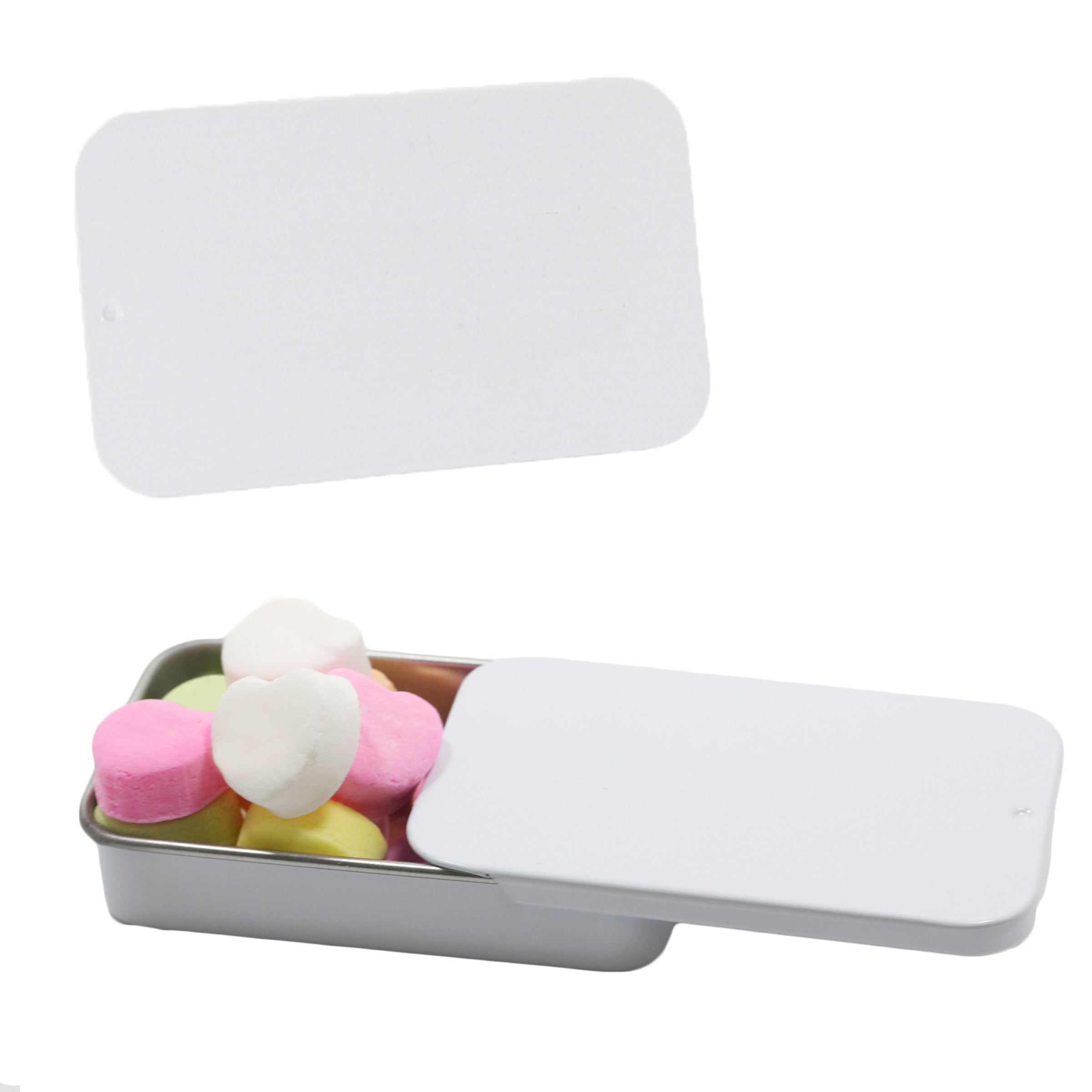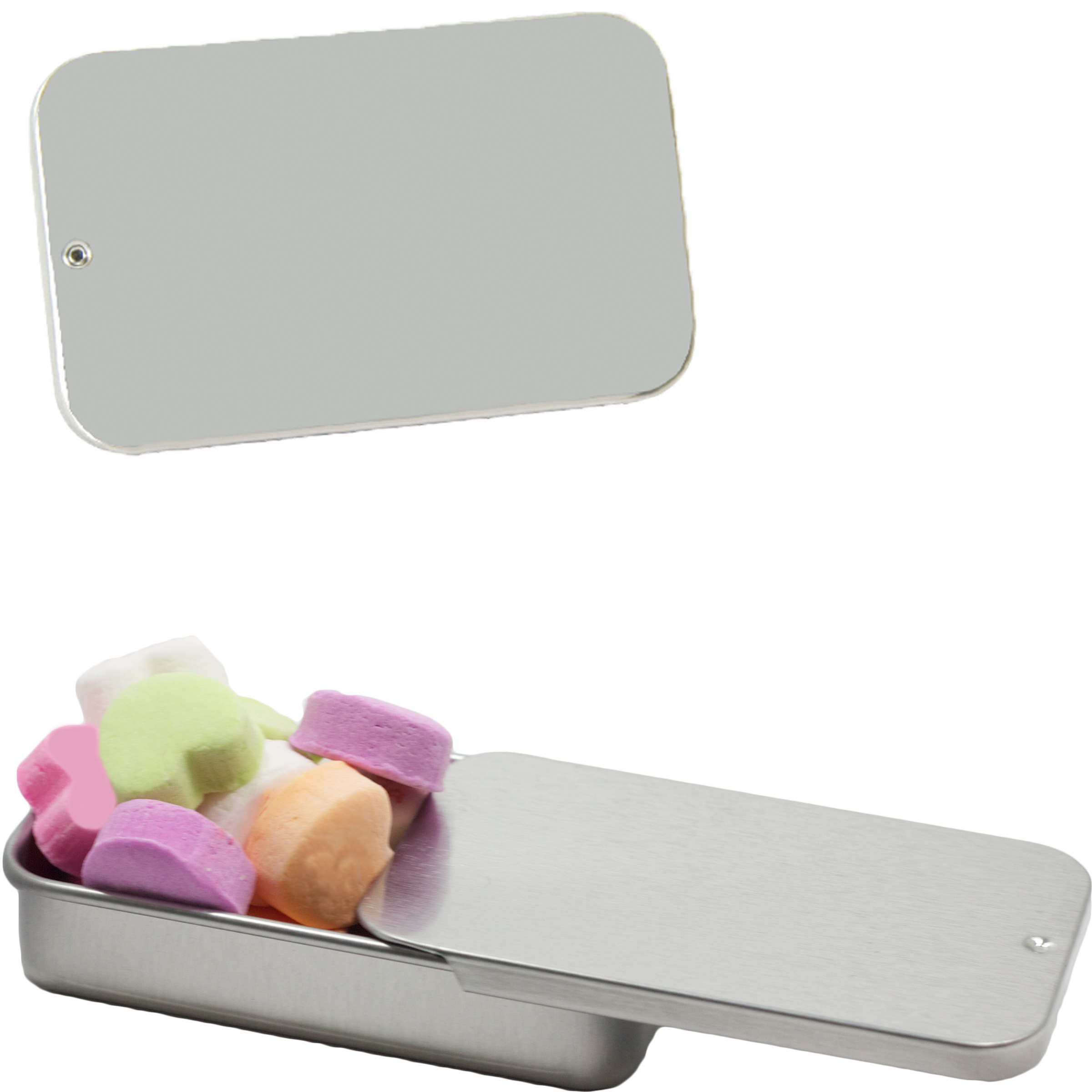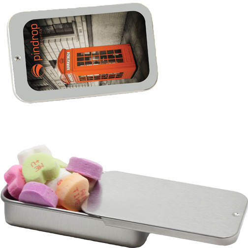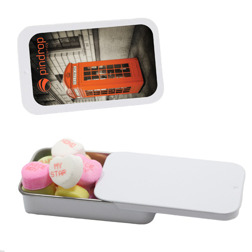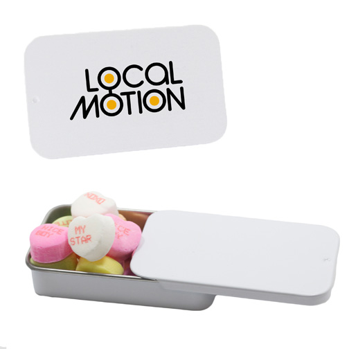 $60(v) for conversation hearts. $60(v) for tin. Price includes red text of three phrases. Each additional phrase $0.10(v). 1st line max of 8 characters. 2nd line max of 5 characters.