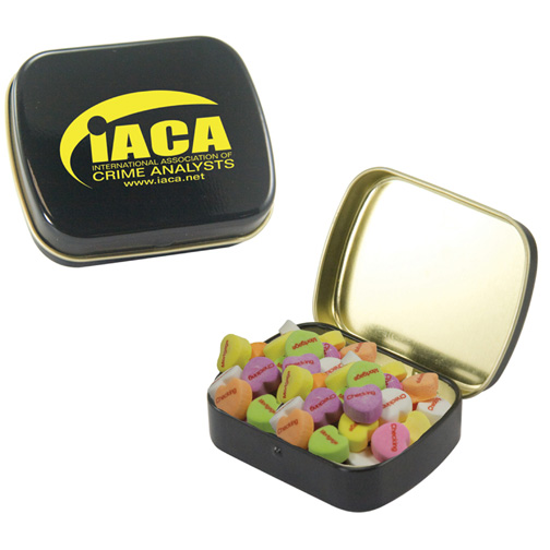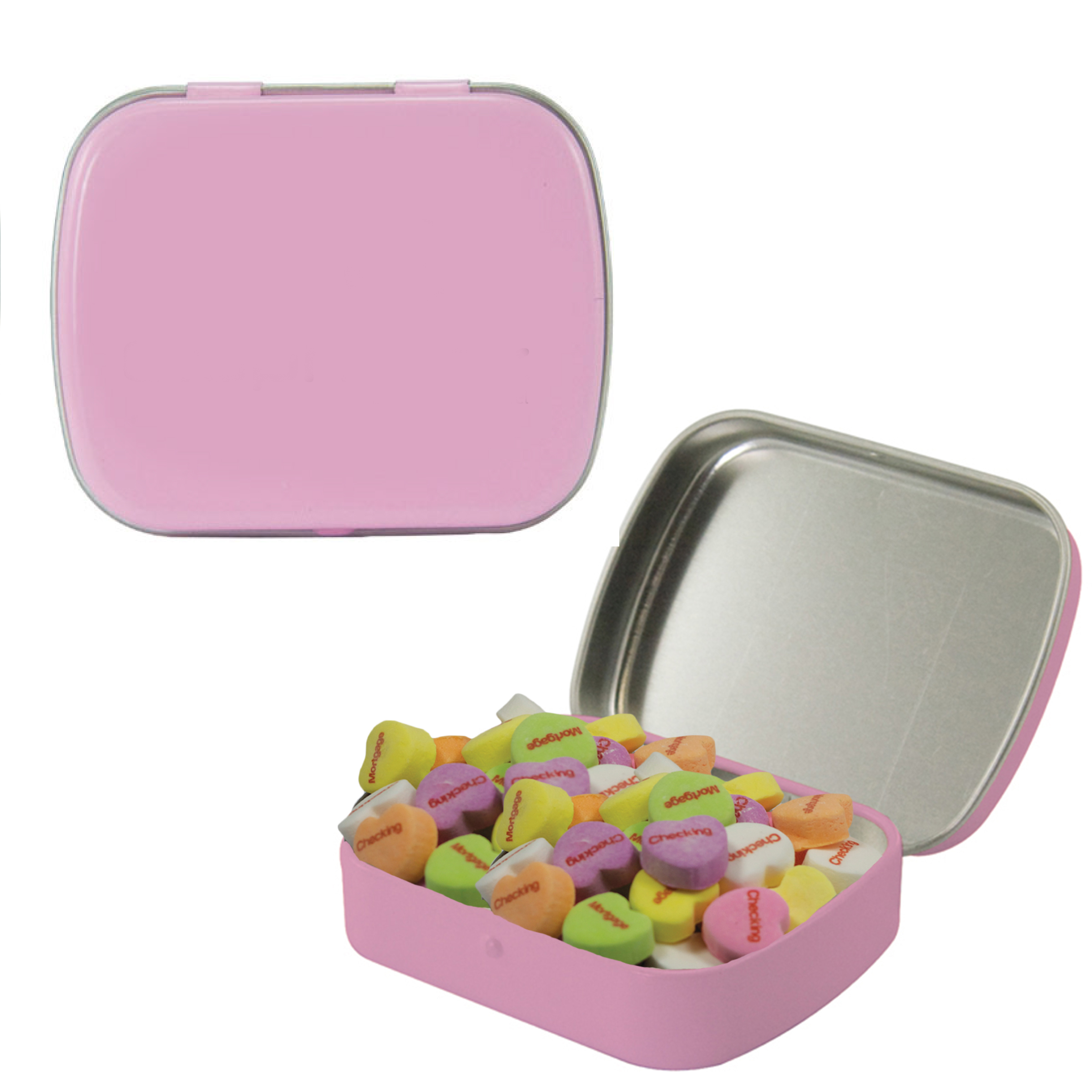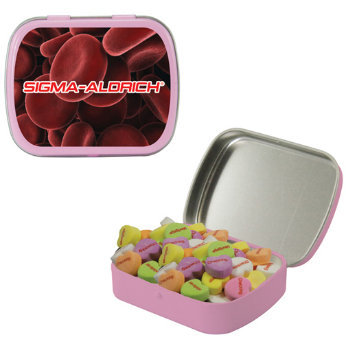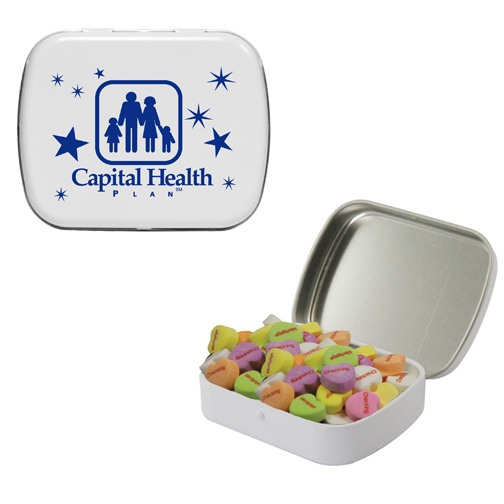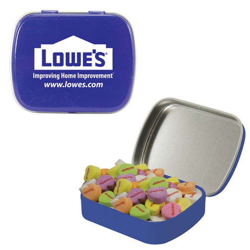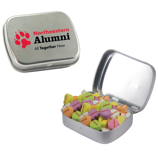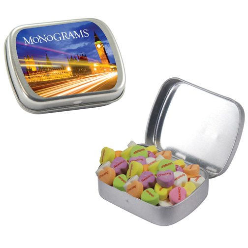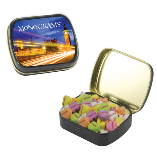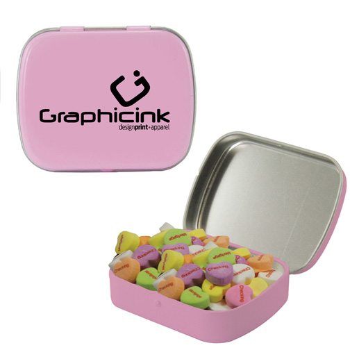 $60(v) for conversation hearts. $60(v) for tin. Price includes red text of three phrases. Each additional phrase $0.10(v). 1st line max of 8 characters. 2nd line max of 5 characters.
