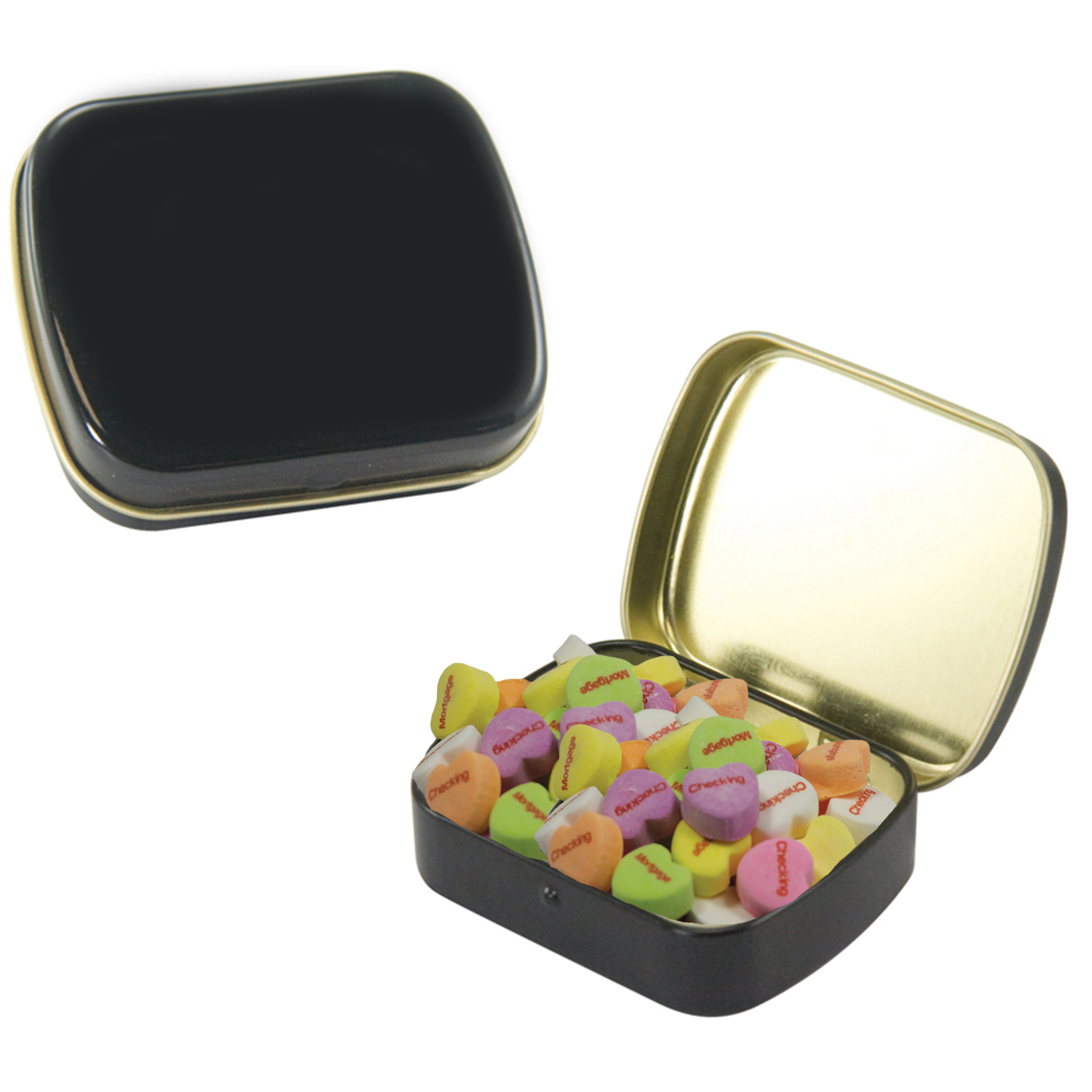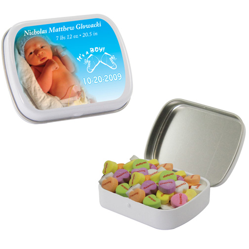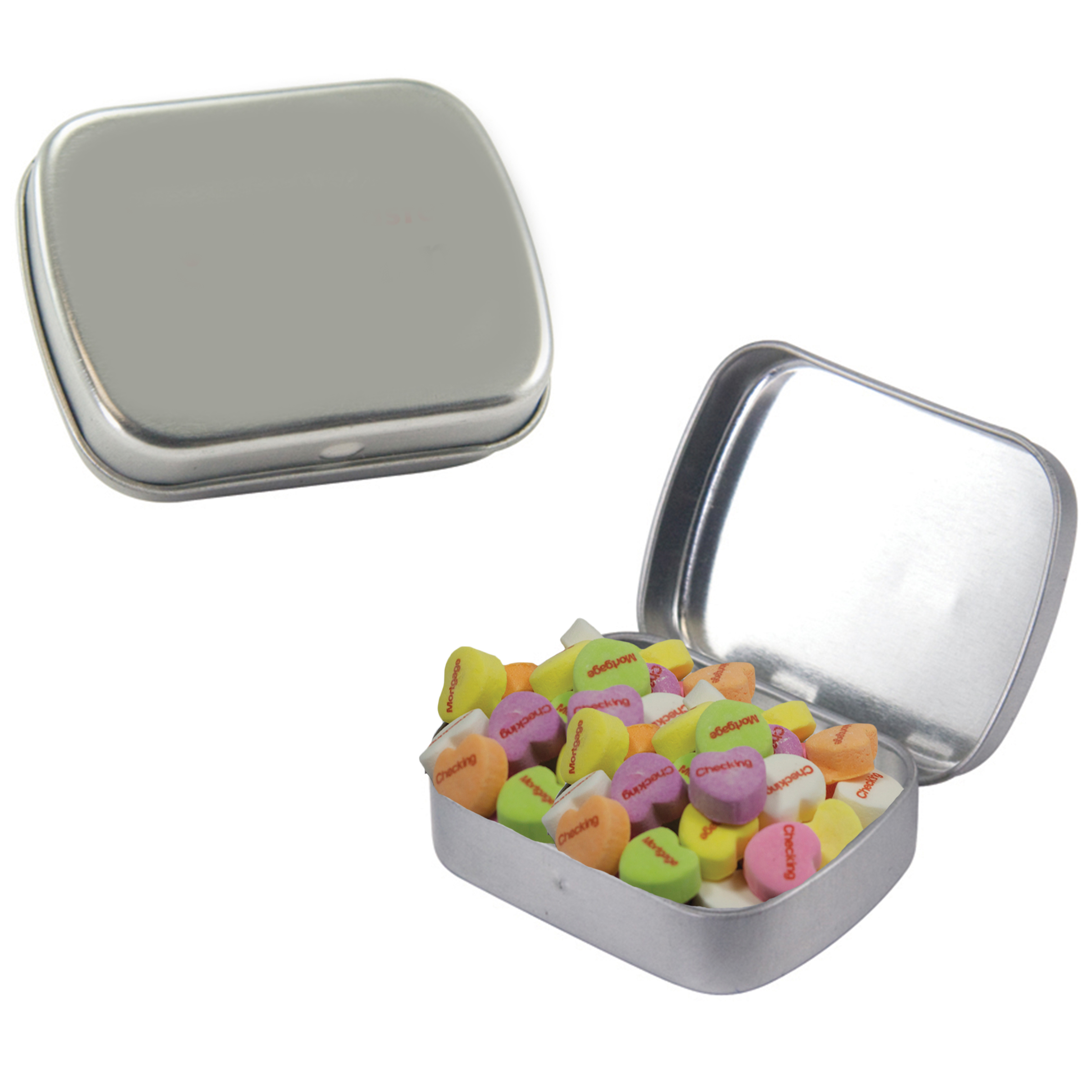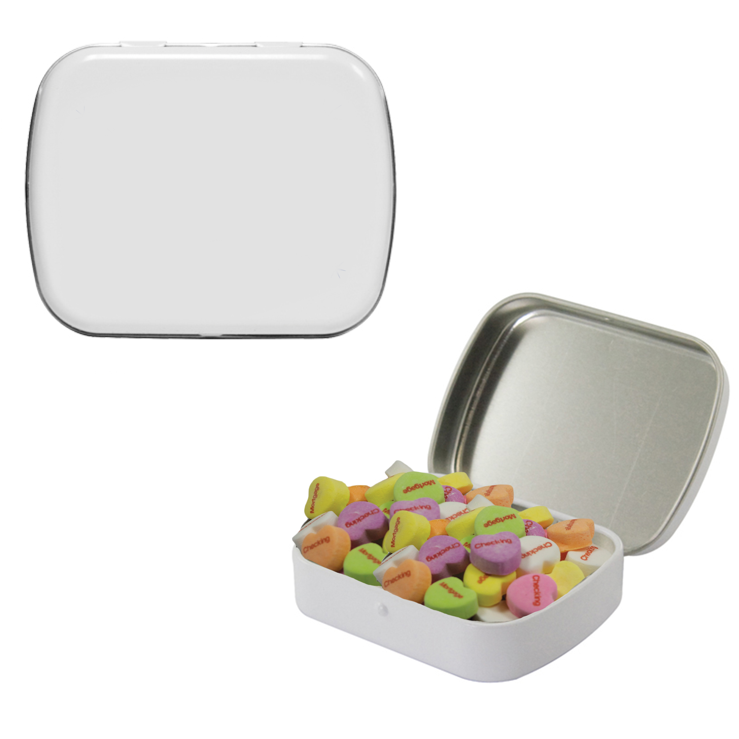 $60(v) for conversation hearts. $60(v) for tin. Price includes red text of three phrases. Each additional phrase $0.10(v). 1st line max of 8 characters. 2nd line max of 5 characters.