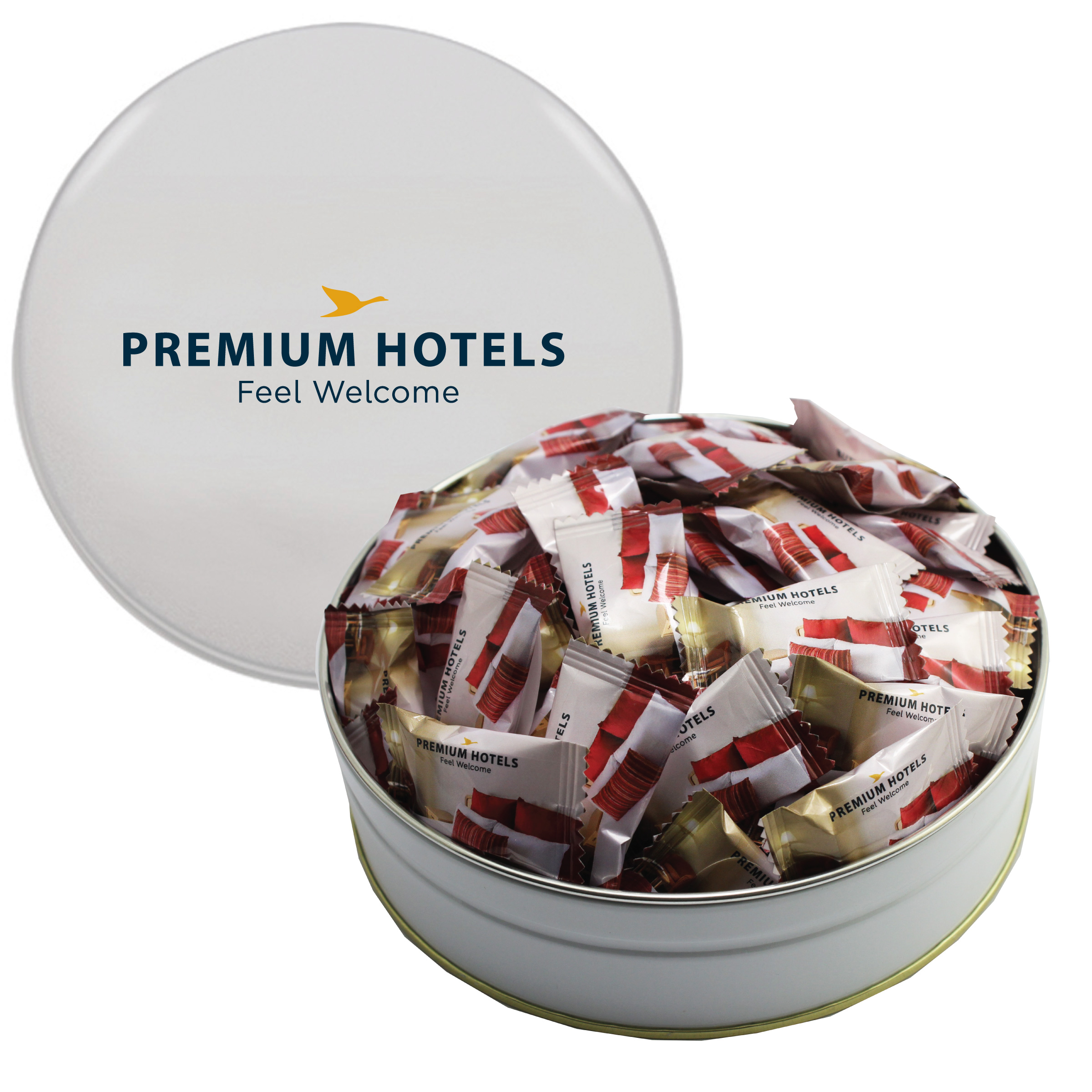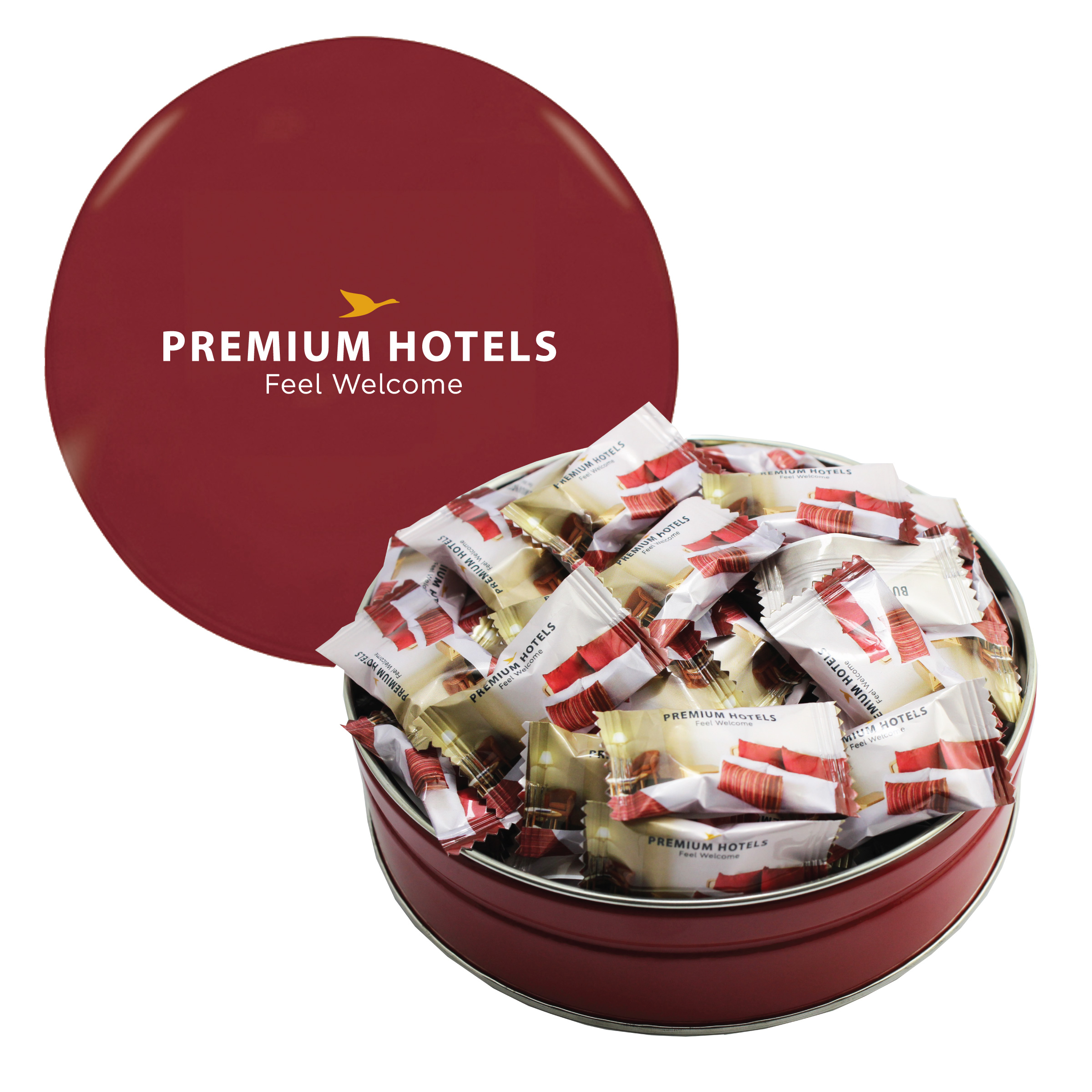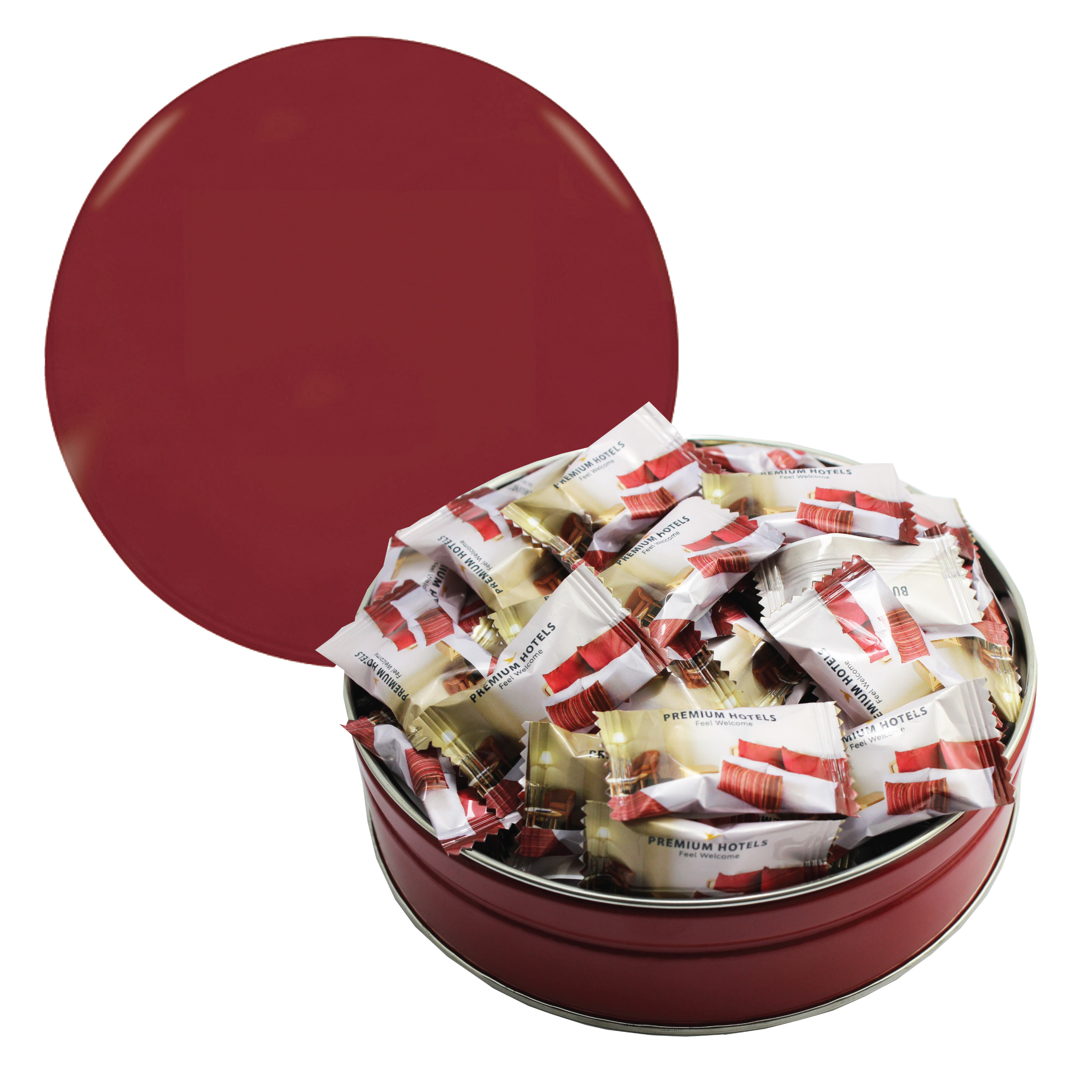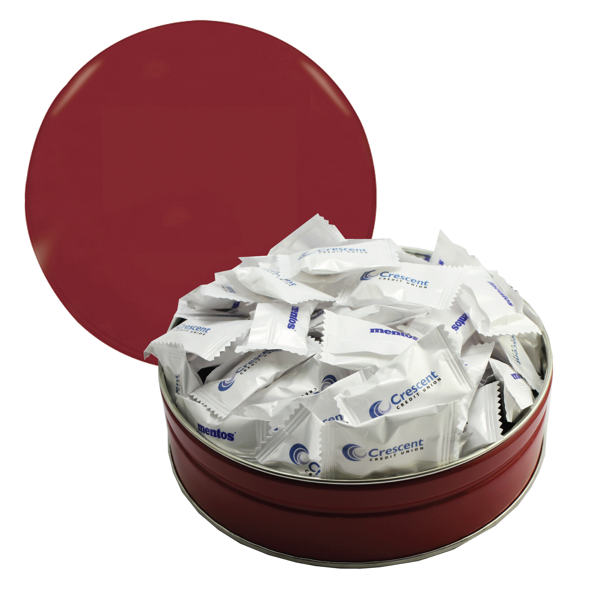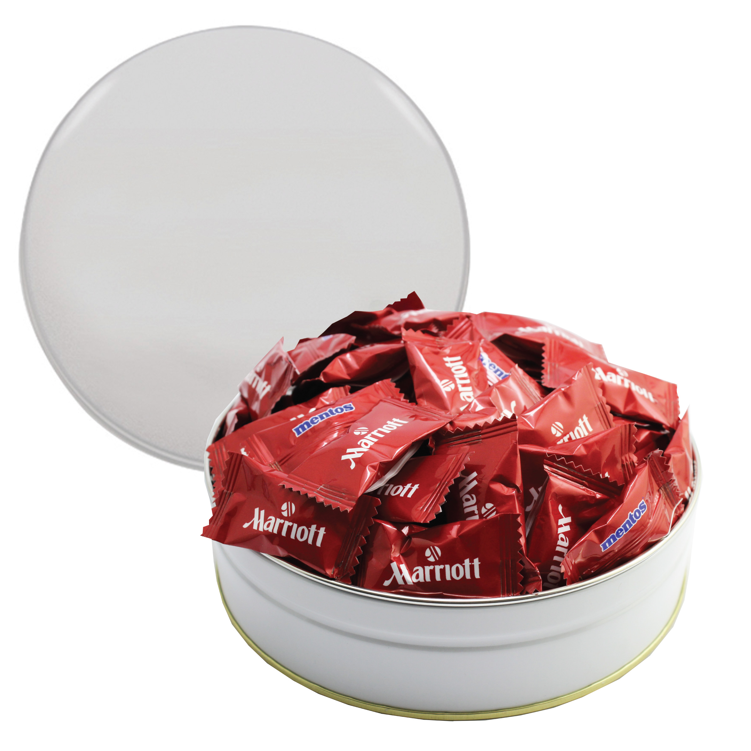 $85(v). Price includes custom wrapper on mints with one color direct imprint on the lid of the solid colors or a greeting card for the designer tins. Two-four color imprint, add $0.60(v) plus an additional setup. PMS color match for direct imprint $60(v). Add a laminated decal $0.75(v)