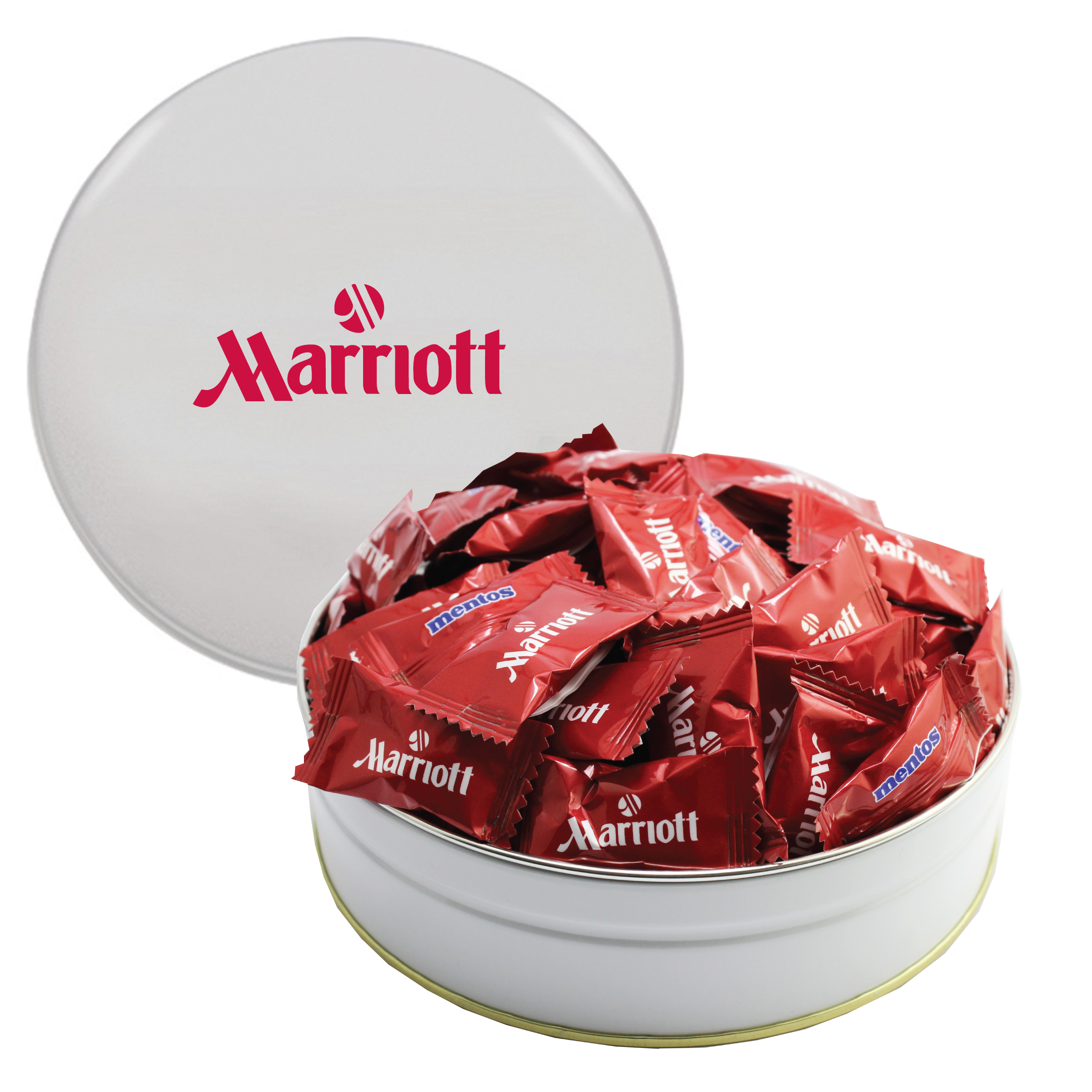 $42.50(v). Price includes custom wrapper on mints with one color direct imprint on the lid of the solid colors or a greeting card for the designer tins. Two-four color imprint, add $0.60(v) plus an additional setup. PMS color match for direct imprint $60(v). Add a laminated decal $0.75(v)