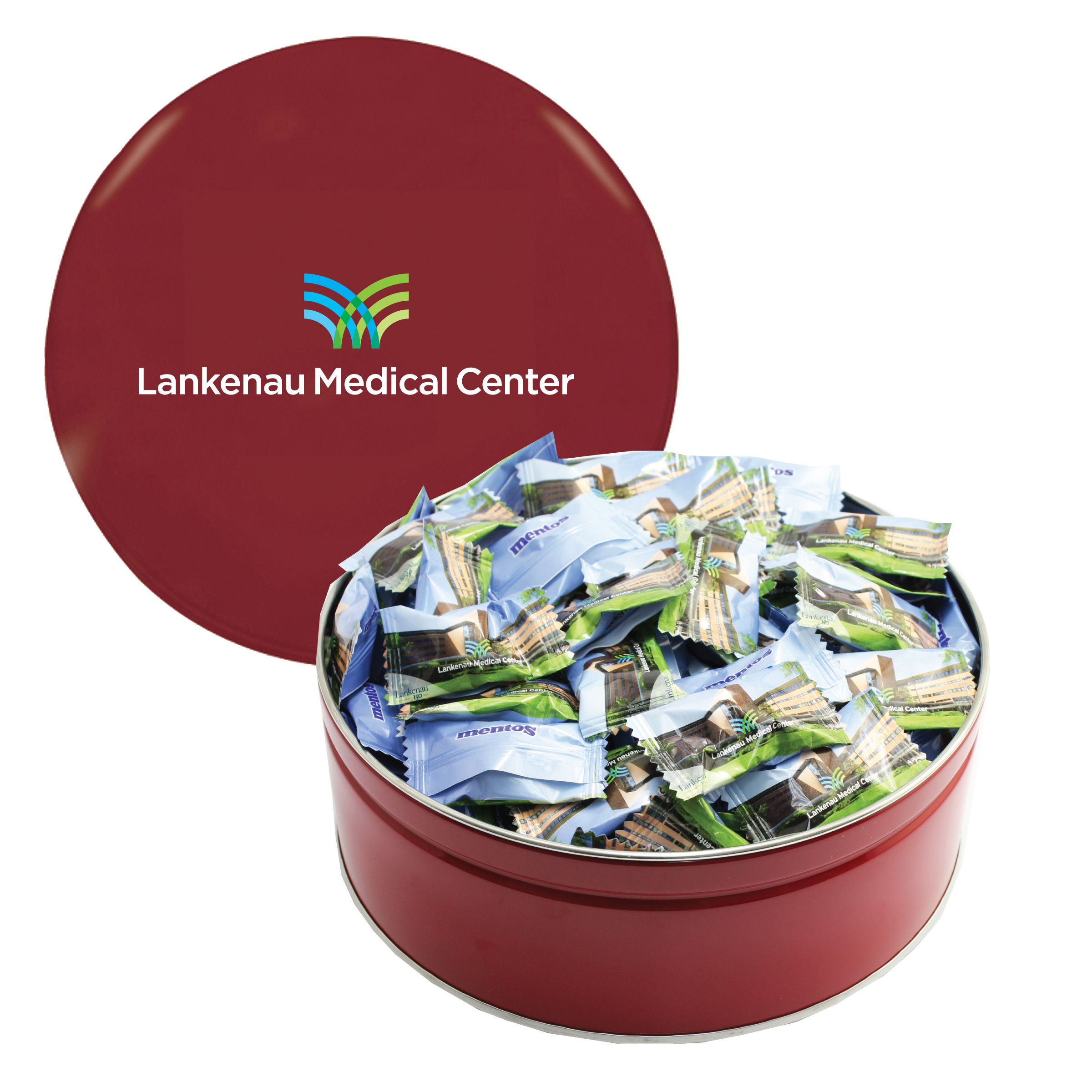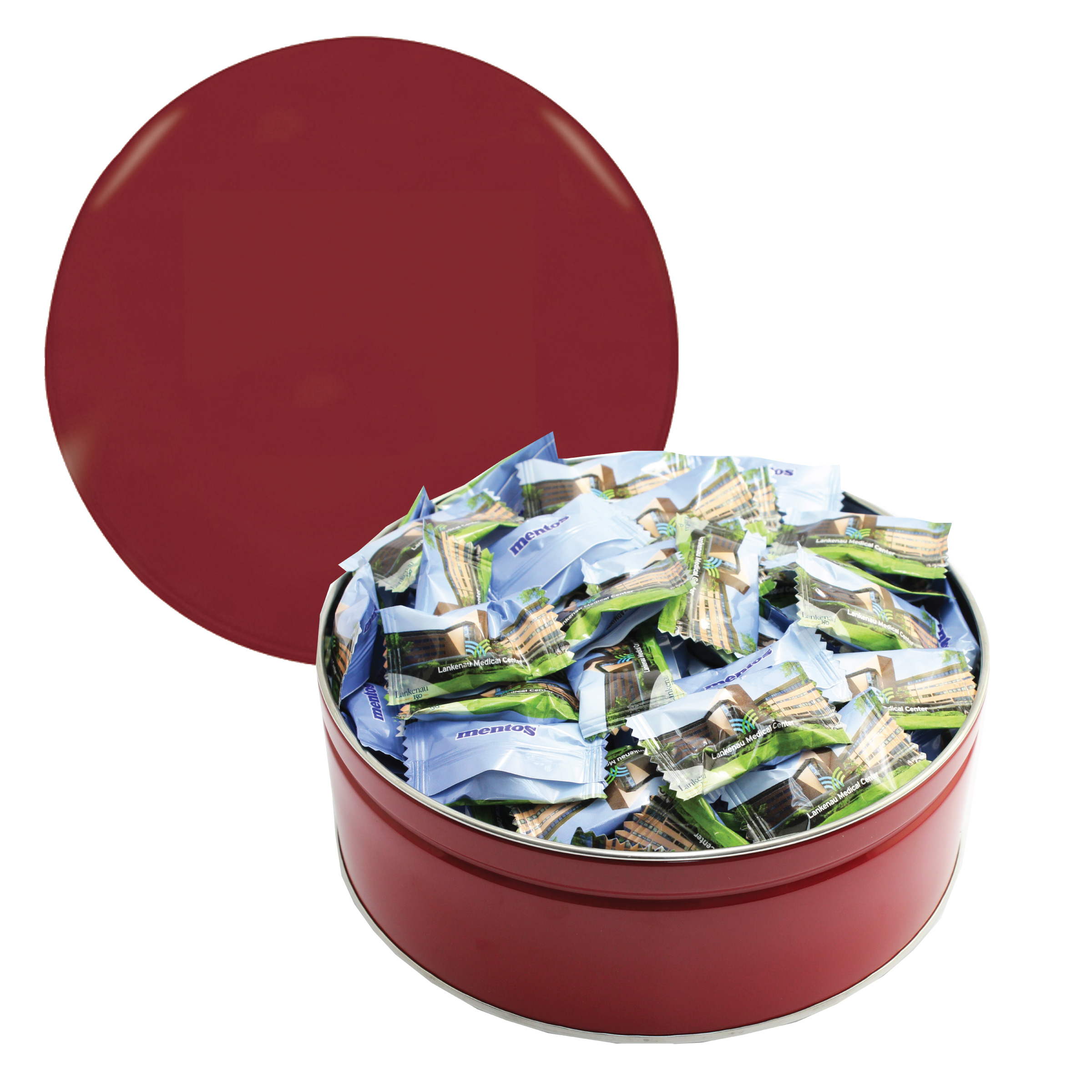 $42.50(v). Price includes custom wrapper on mints with one color direct imprint on the lid of the solid colors or a greeting card for the designer tins. Two-four color imprint, add $0.60(v) plus an additional setup. PMS color match for direct imprint $60(v). Add a laminated decal $0.75(v)