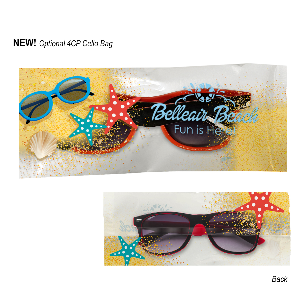 4CP Cello Bag: Add $50.00(G) set up charge plus .30(G) per piece. 4-color process on a white or clear cello bag. Must specify white or clear #4CPCELLO on PO. Choose from one of our stock designs or create your own custom design! 250 piece minimum. Production time for 4-Color Process Cello Bag is 5 to 7 days after proof approval.