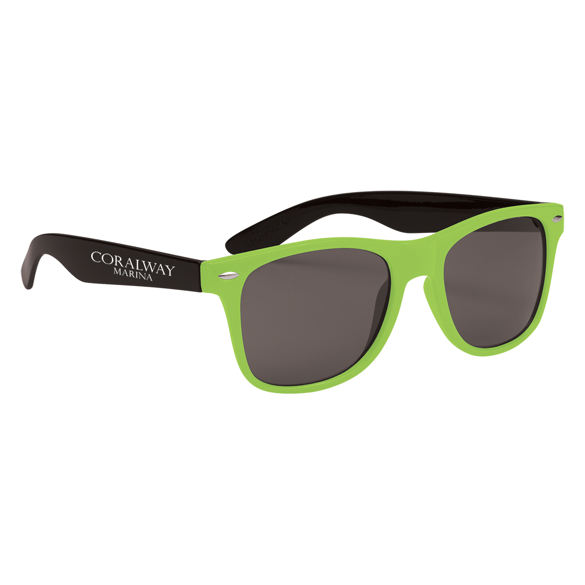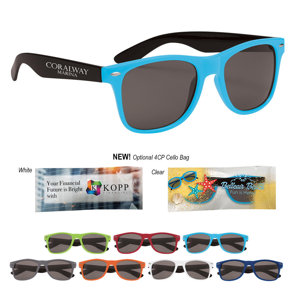 White, Lime Green, Orange, Red, Royal Blue, Light Blue or Gray, all with Black Temples.
