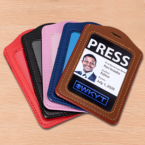 Vertical Faux Leather Holder Design Vertical Faux Leather Holder20 MM wide polyester lanyard allows a wide space for your logo to be printed, These lanyards are idea for your large complex logo. It comes with free metal Bulldog clip with Badge Holder attached.